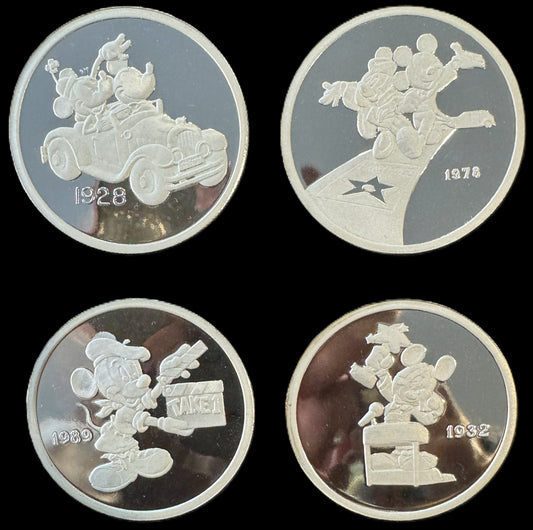 1989 Disney “Hollywood Mickey” 4pc Match COA Set 1 oz .999 Silver Coin