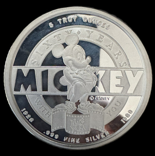 1988 Walt Disney Mickey Mouse 60th Anniversary 5 oz .999 Silver Coin
