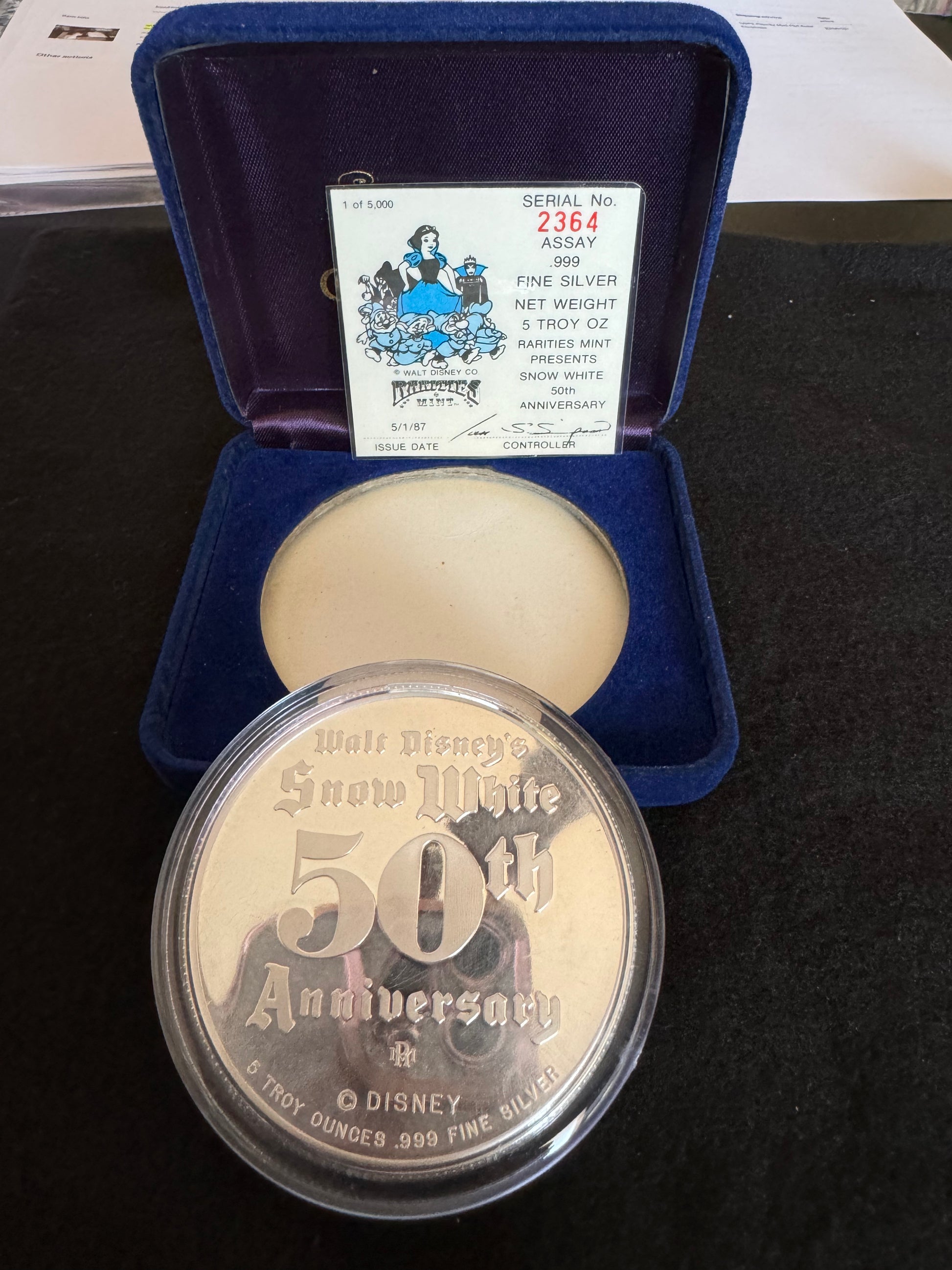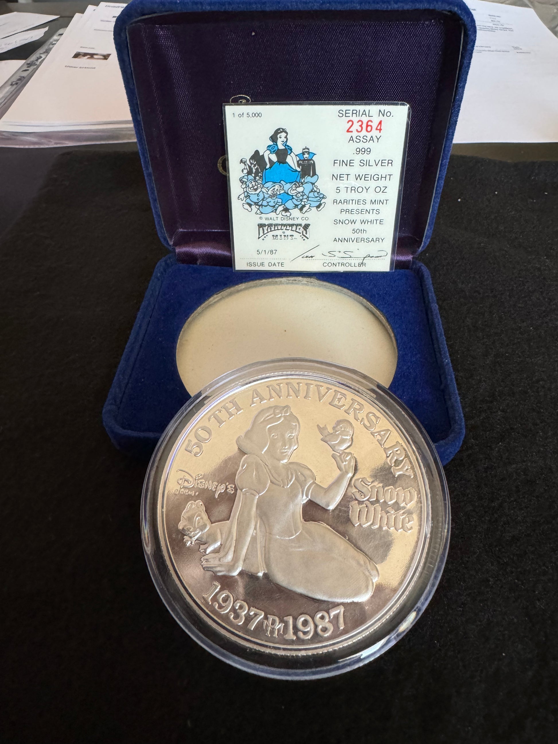 1987 Disney’s 50th Anniversary “Snow White” 5 oz .999 Silver Coin