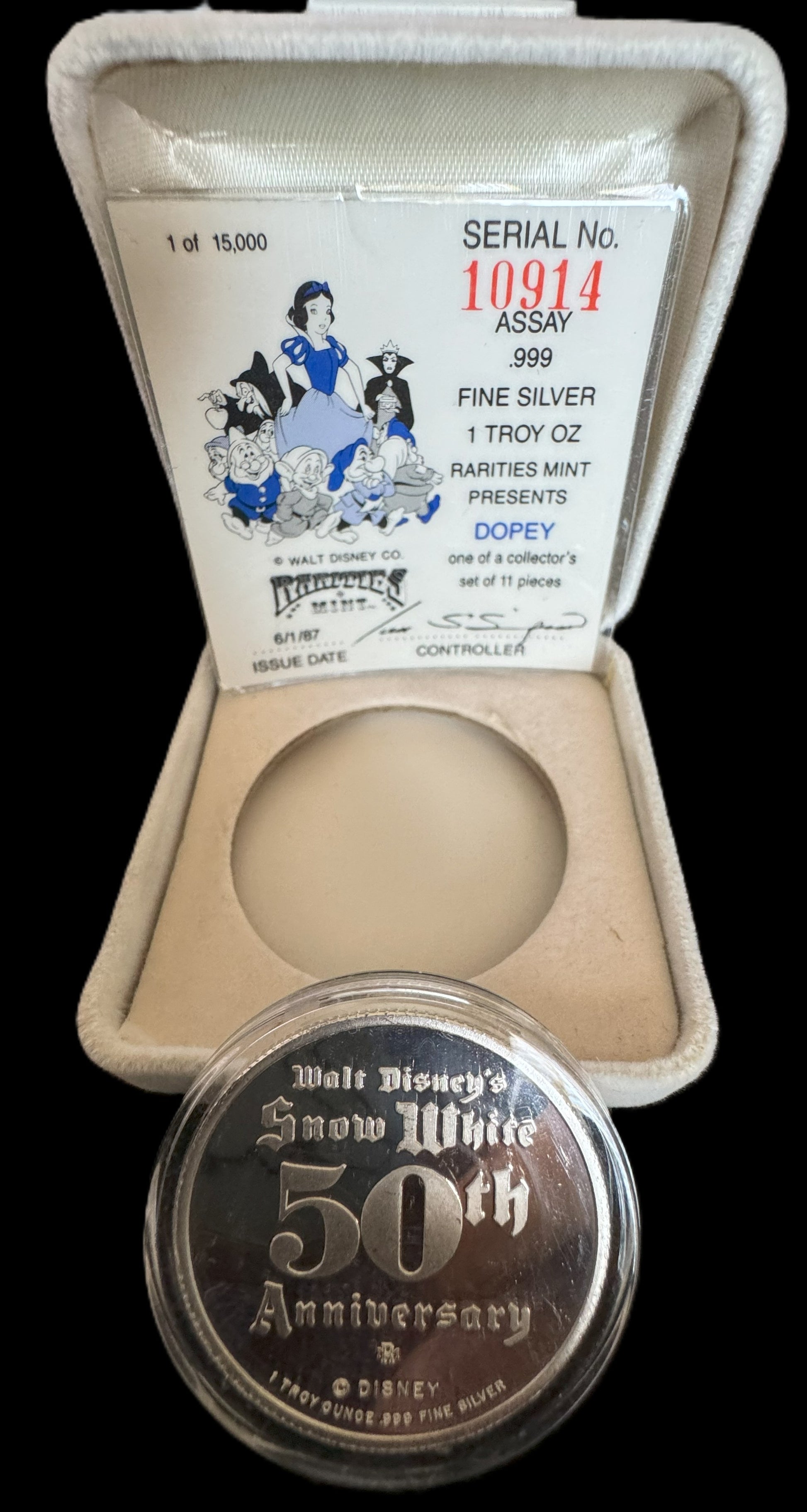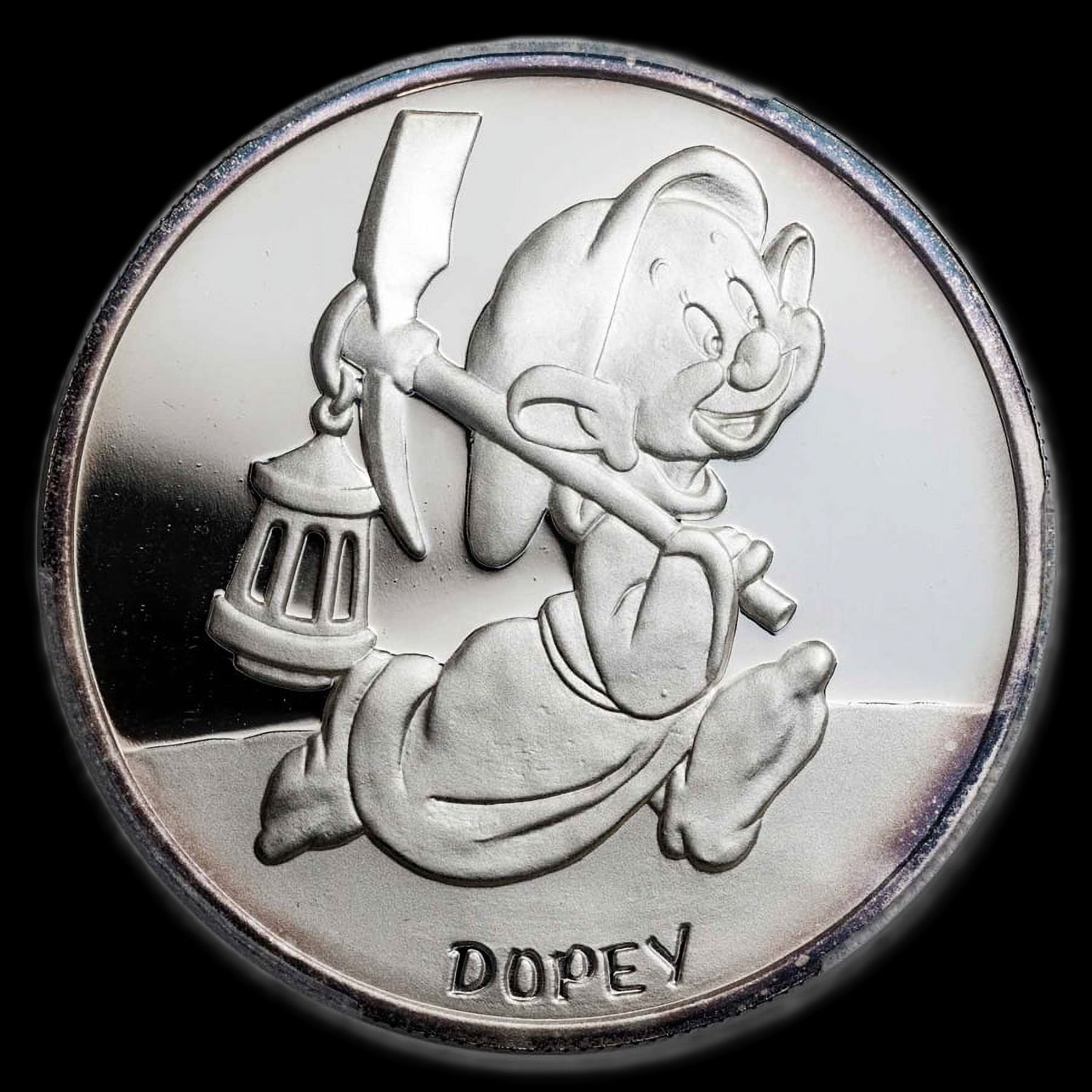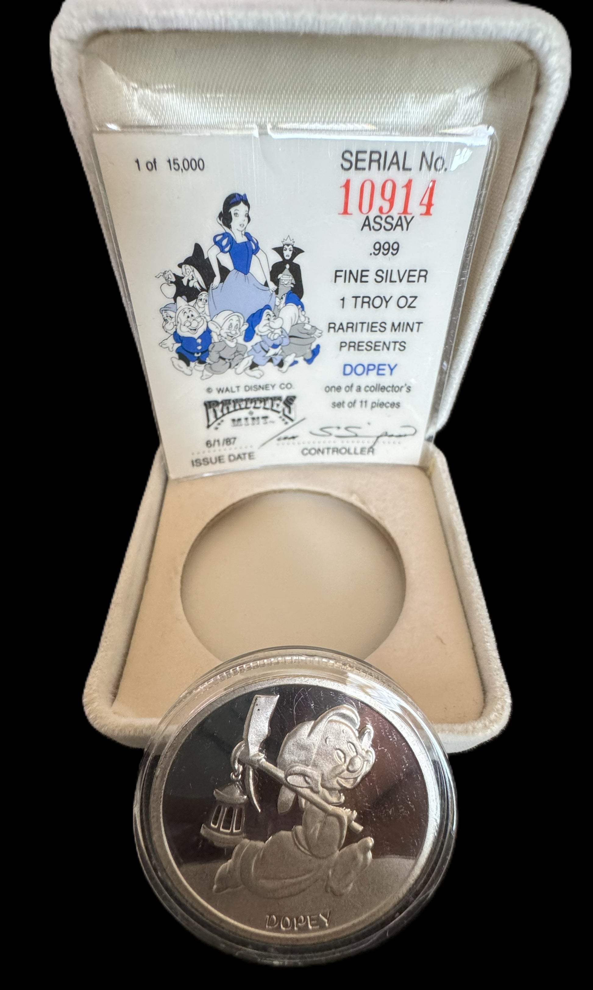 1987 Disney’s 50th Snow White & The Seven Dwarfs “Dopey” 1 oz .999 Silver Coin