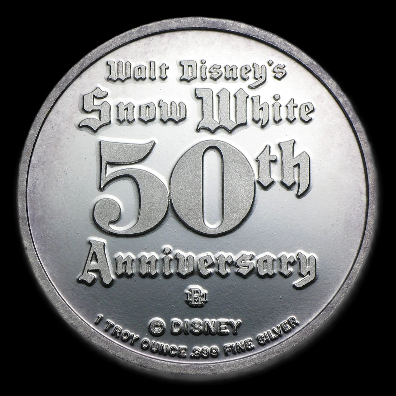 The 1987 Disney's 50th Anniversary Snow White & The Seven Dwarfs "Dopey" 1 oz .999 Silver Coin is a round silver coin featuring the character of Dopey from the iconic Disney movie. This officially licensed collectible is part of a series celebrating the 50th Anniversary of Snow White and the Seven Dwarfs, minted in the United States by Rarities Mint with a fineness of .999. The coin comes with a Certificate of Authenticity (#10914) and the original box which is a valuable addition to any Disney or coin collection.