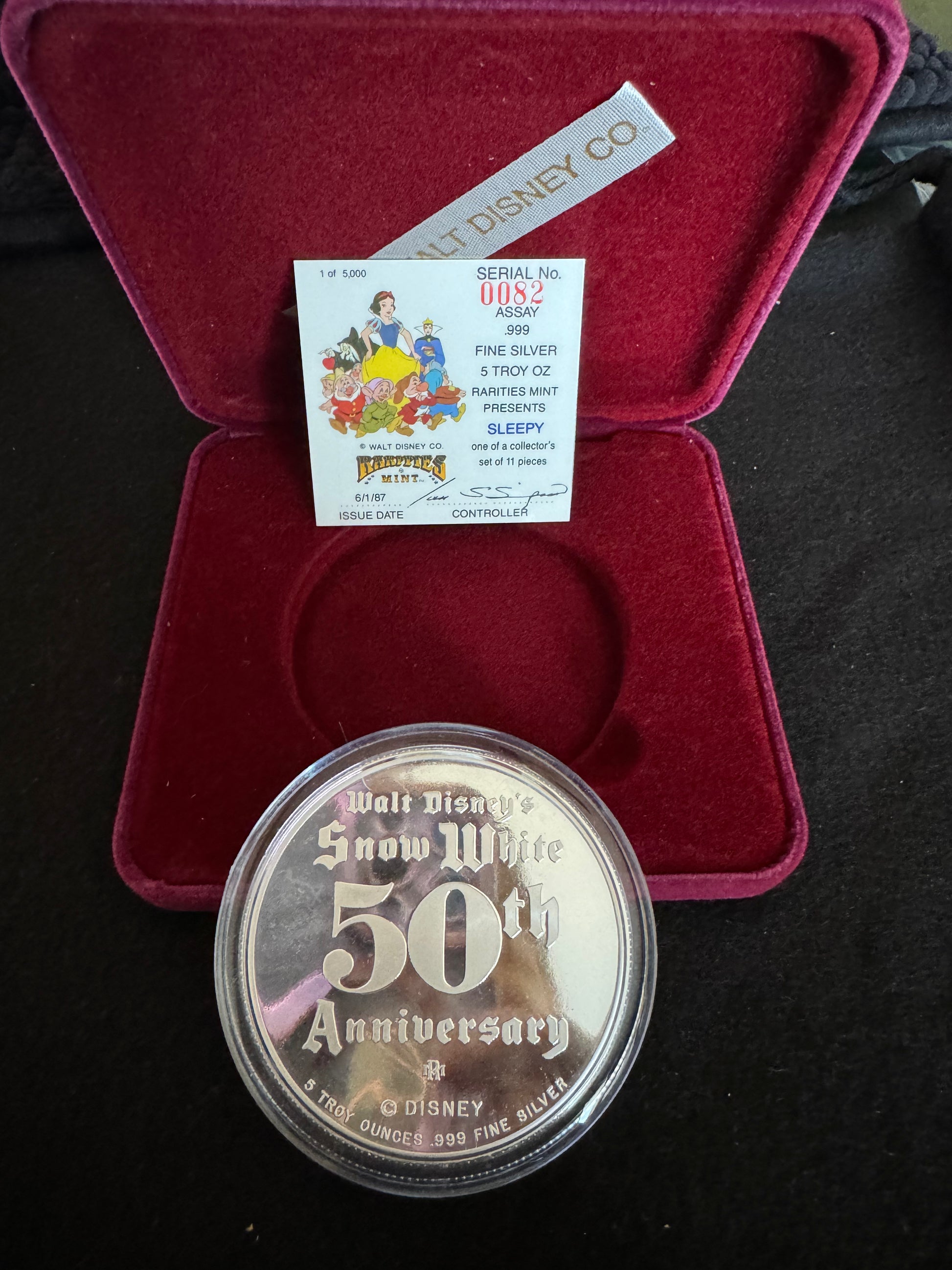 The 1987 Disney's 50th Anniversary Snow White & The Seven Dwarfs "Sleepy" 5 oz .999 Silver Coin is a round silver coin featuring the character of Sleepy from the iconic Disney movie. This officially licensed collectible is part of a series celebrating the 50th Anniversary of Snow White and the Seven Dwarfs, minted in the United States by Rarities Mint with a fineness of .999. The coin comes with a Certificate of Authenticity (#82) and the original box which is a valuable addition to any Disney or coin collection.