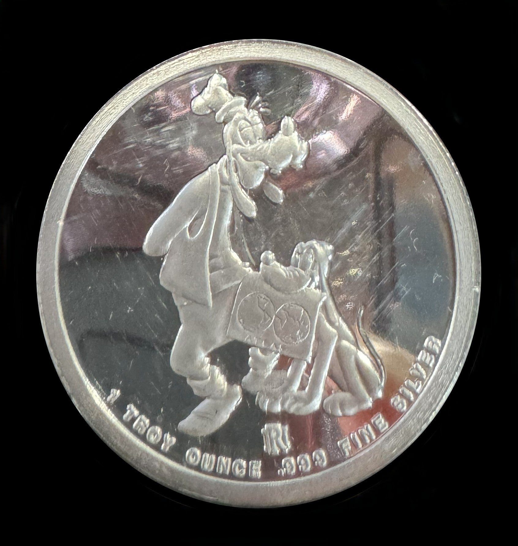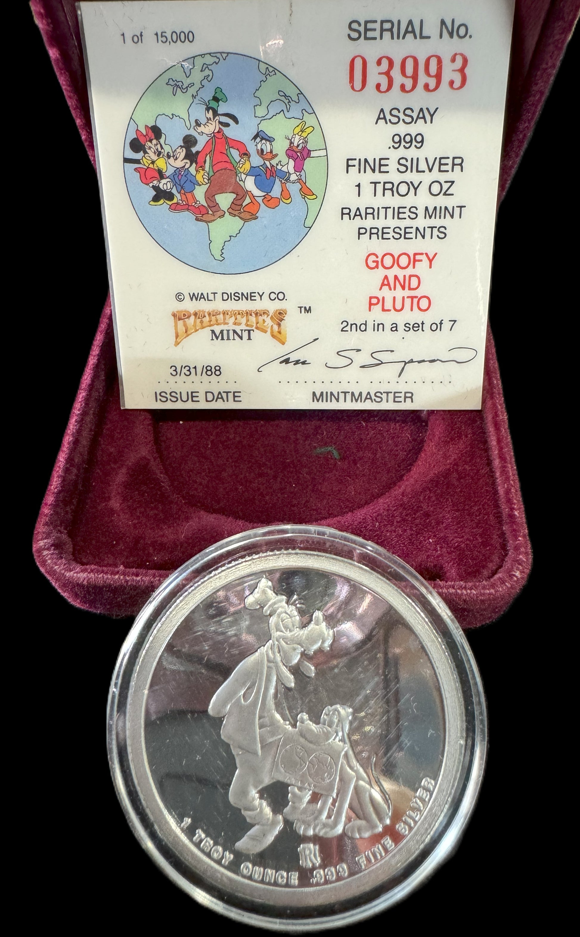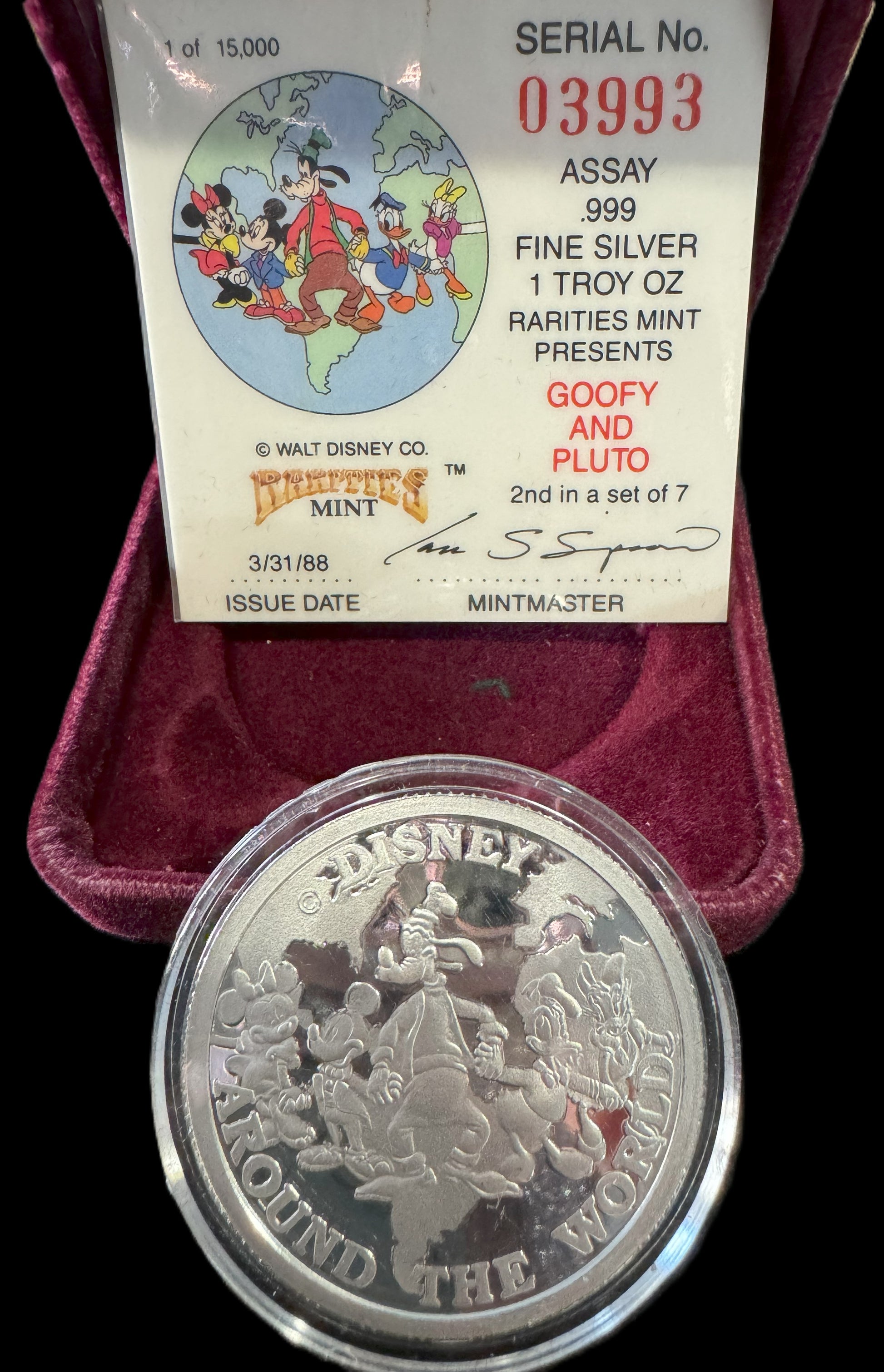 1988 Disney Around the World “Goofy & Pluto” 1 oz .999 Silver Coin COA #3993