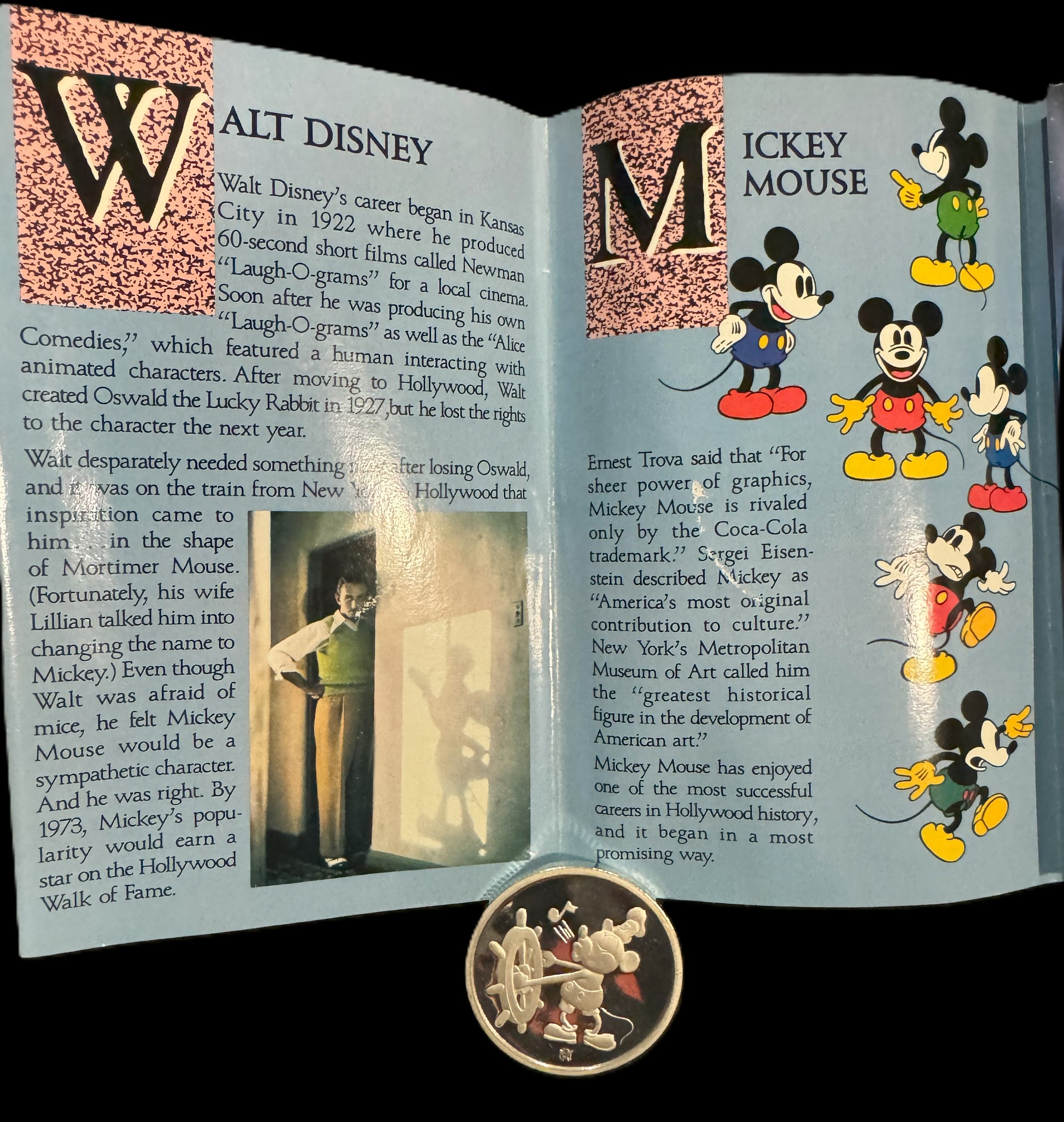 The 1988 Disney Mickey 60 Years With You 1 oz .999 Silver Coin was minted by Rarities Mint to commemorate Mickey Mouse's 60th anniversary. This round coin features a design of Mickey Mouse and contains 1 oz of .999 fine silver. It is an officially licensed Disney collectible and comes with a Certificate of Authenticity numbered 047916. The coin was manufactured in the United States as part of the Disney franchise, making it a sought-after piece for collectors of Disney memorabilia and silver coins.