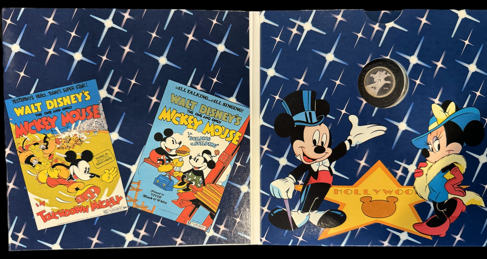 The 1989 Disney "You Are My Star" silver coin is a rare collectible minted by Rarities Mint featuring the iconic character Mickey Mouse. This round coin weighs 2.83 grams and is composed of .999 silver, making it a valuable piece for Disney and coin collectors alike. The coin is an official Disney product from the United States, part of the franchise's memorabilia that captures the magic of Disney's beloved characters like Mickey Mouse in a timeless silver form.