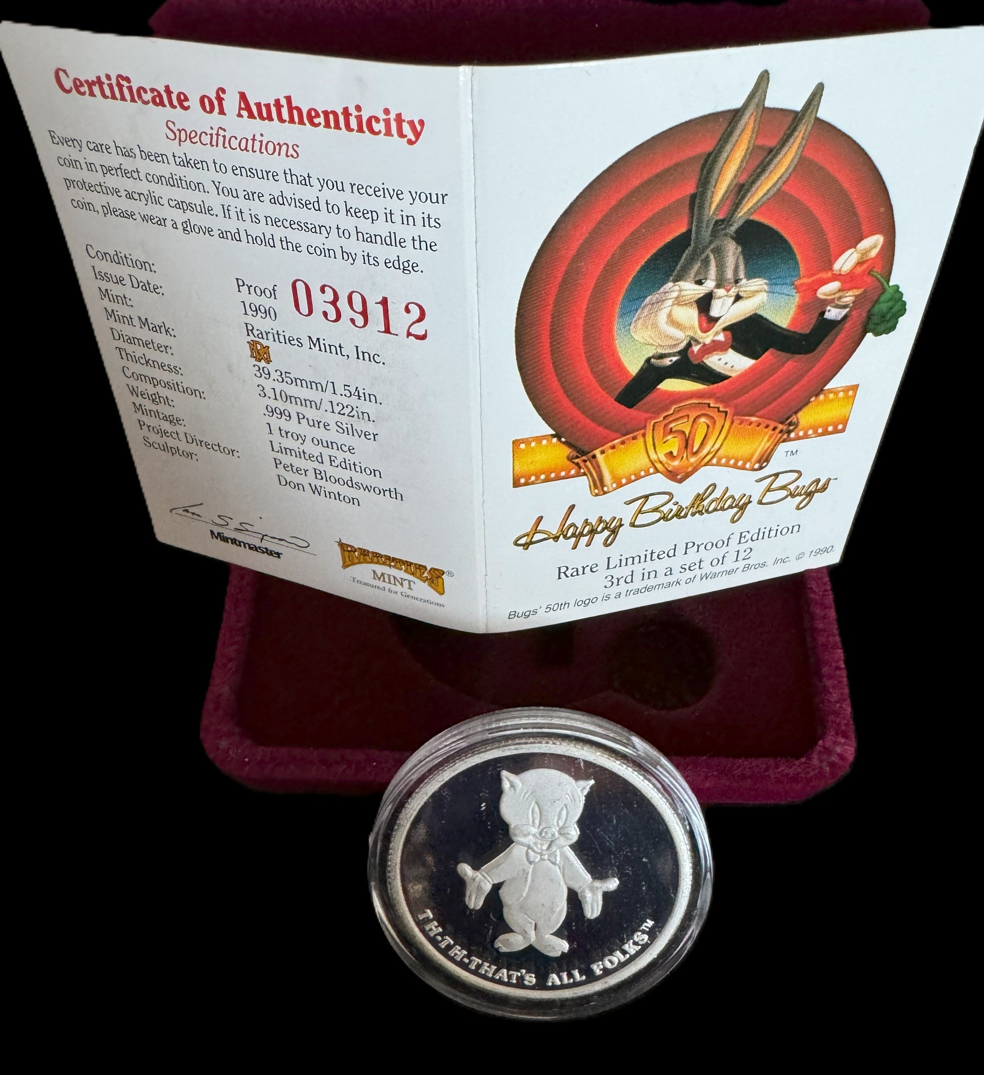 1990 Happy Birthday Bugs Porky Pig Limited Proof Edition 1oz .999 Silver Coin