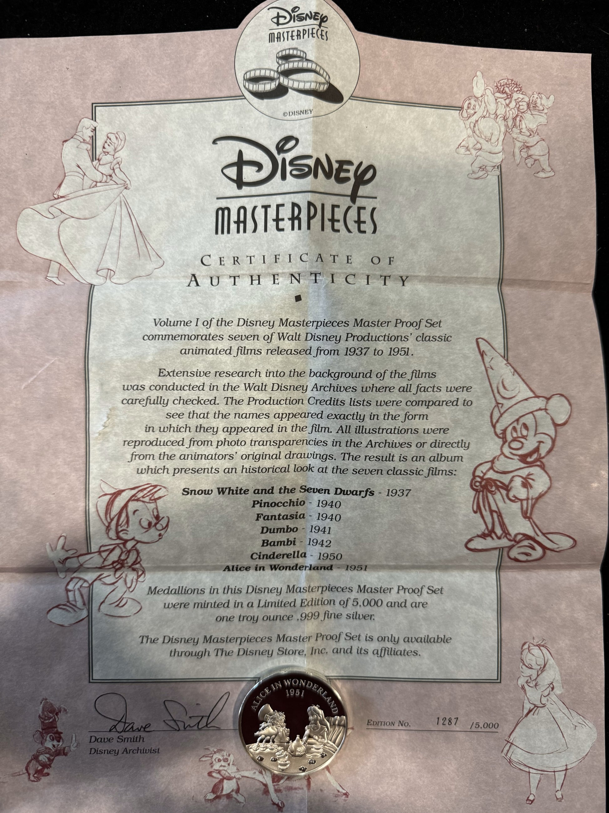 1992 Disney Masterpieces Alice In Wonderland 1 oz .999 Silver Coin #1287