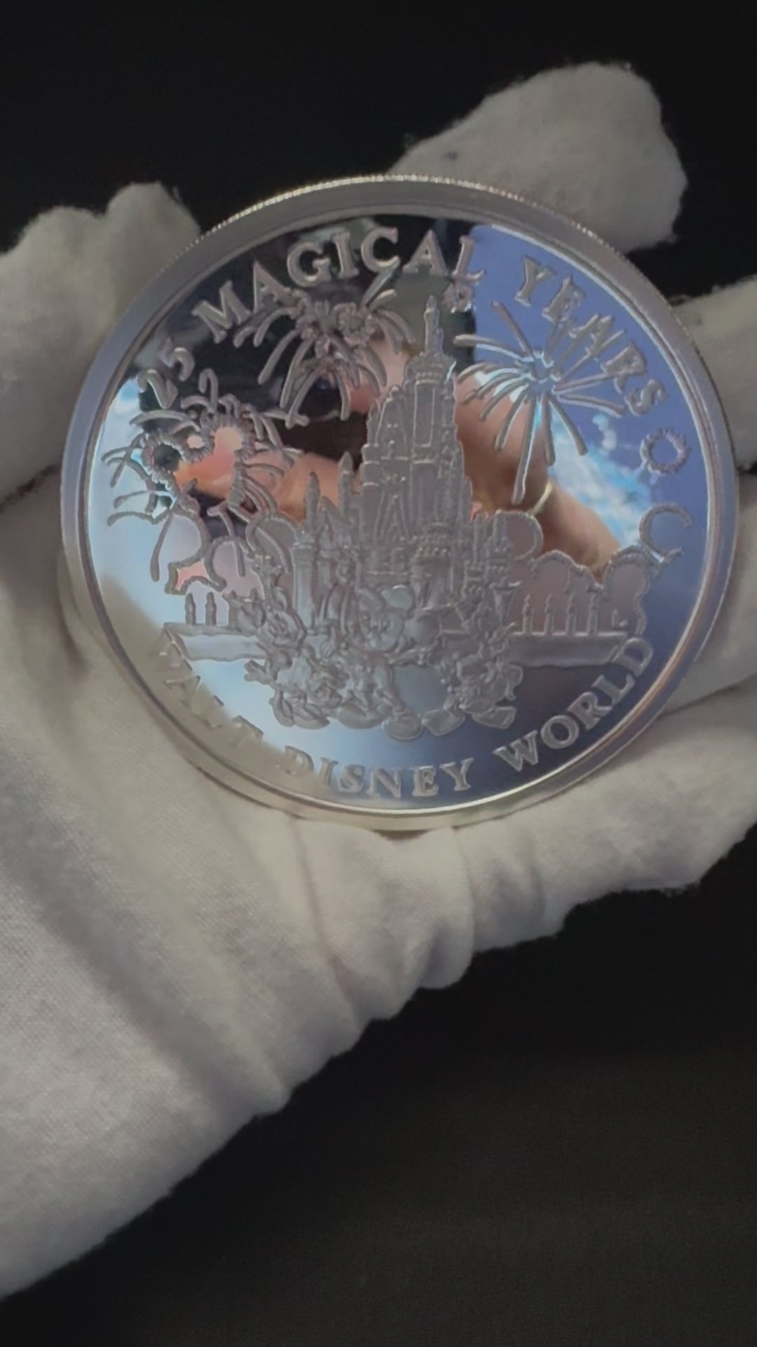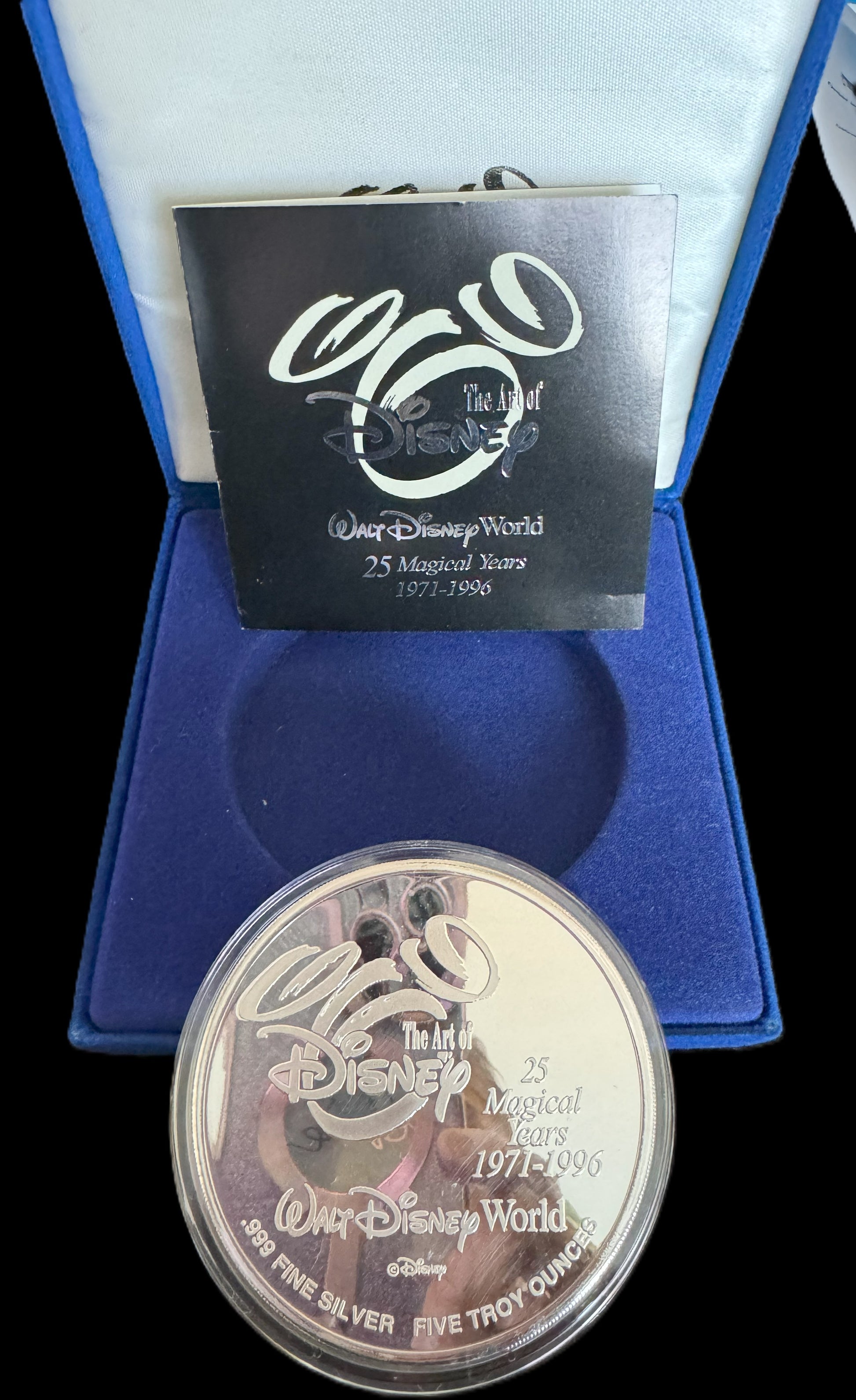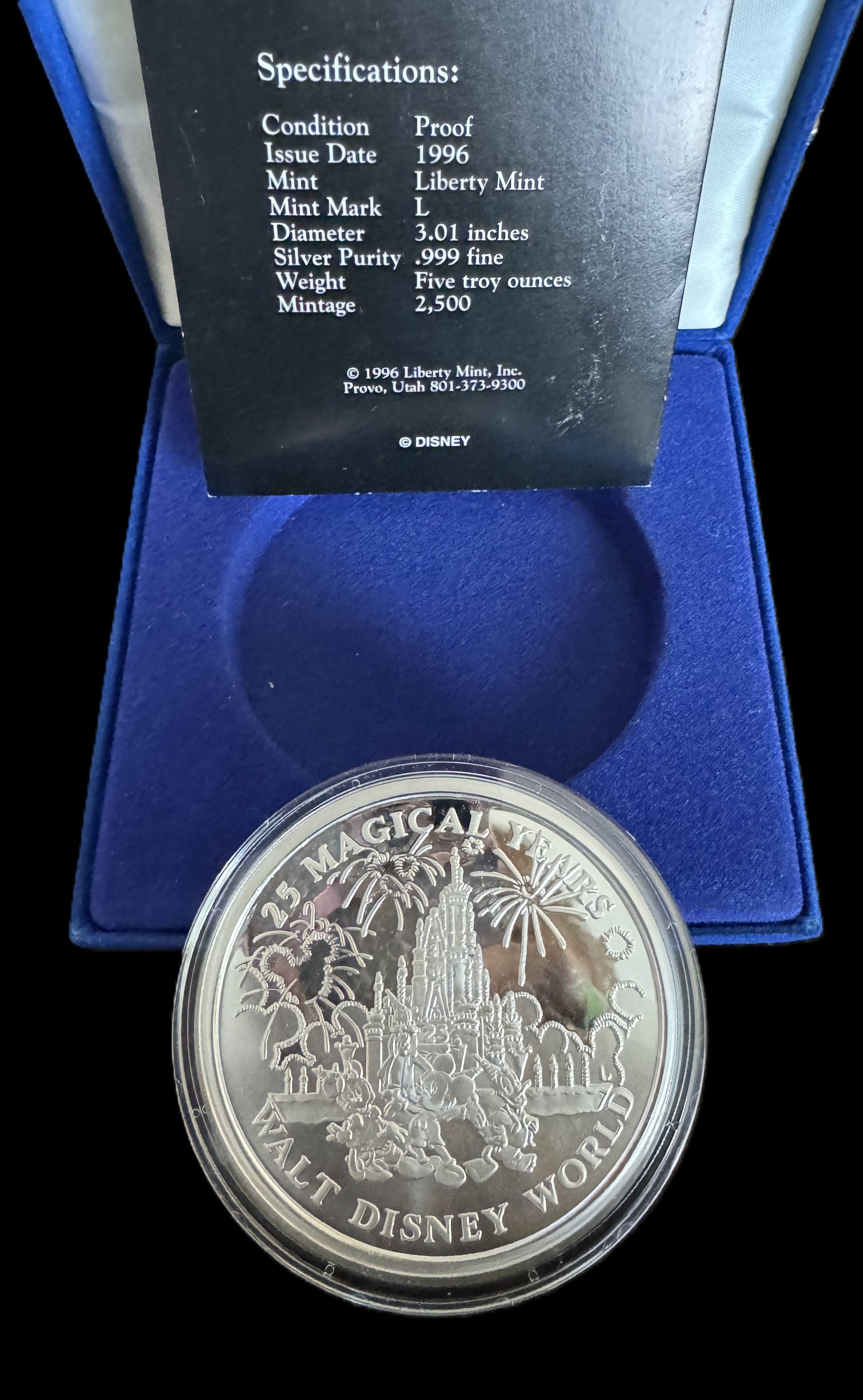 EXTREMELY RARE! HARD TO FIND! The 1996 Disney World 25th Anniversary 5 oz .999 Silver Coin features Mickey Mouse and is part of the Disney franchise. It was minted by Liberty Mint in the United States with a round shape and a fineness of .999. The coin is a Ultra Brilliance Proof strike type and comes with a Certificate of Authenticity (#1451). This collectible Disney silver coin is a standout piece for any Disney or coin collector, commemorating a significant milestone in Disney history.