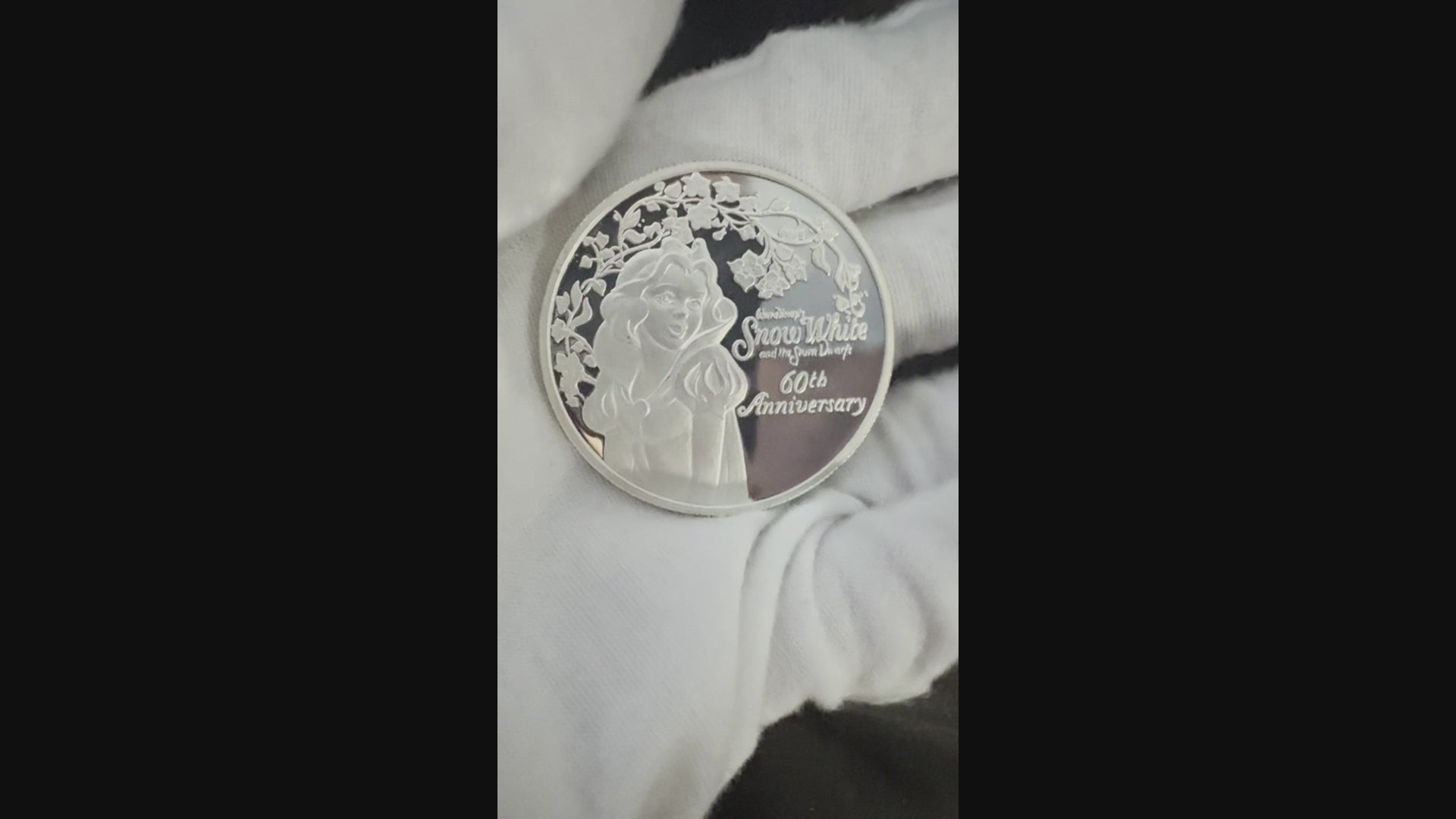 RARE! HARD TO FIND! The 1997 Disney Snow White 60th Anniversary 1 oz .999 Silver Coin features a design inspired by the classic tale of Snow White and the Seven Dwarfs. This round-shaped coin is composed of .999 fine silver and was minted in the United States as part of the Disney franchise. Celebrating the 60th anniversary of the beloved Disney film, this collectible piece is a unique addition to any Disneyana or coin collection. NO COA!