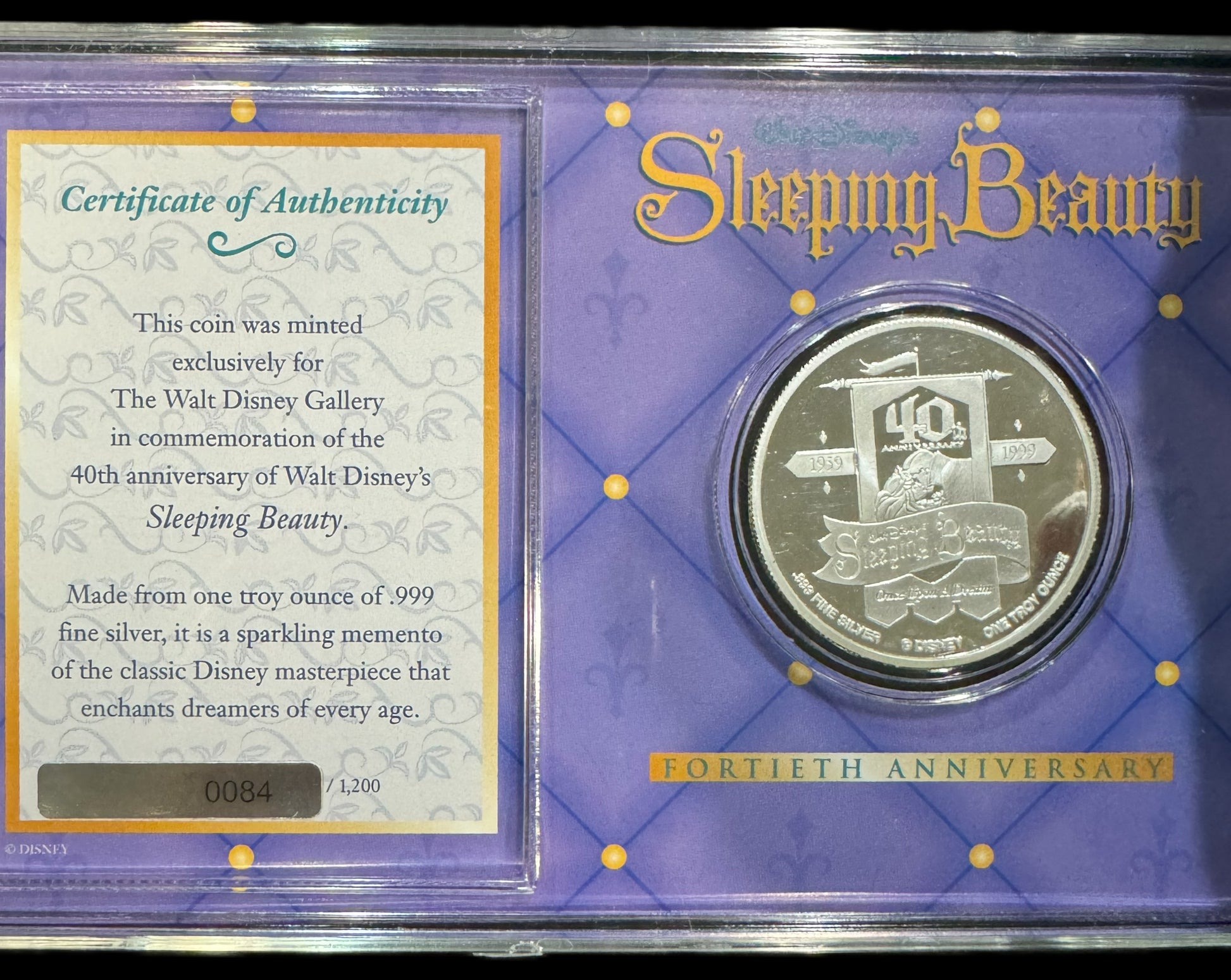 The 1999 Disney Sleeping Beauty 40th Anniversary 1 oz .999 Silver Coin, minted by Liberty Mint in the United States, features Sleeping Beauty as part of the Disney franchise. This round coin commemorates the 40th anniversary of the beloved Disney animated film and is made of .999 fine silver with a total precious metal content of 1 oz. The coin comes with a Certificate of Authenticity (#0084) and is a sought-after collectible for Disneyana enthusiasts and coin collectors alike.