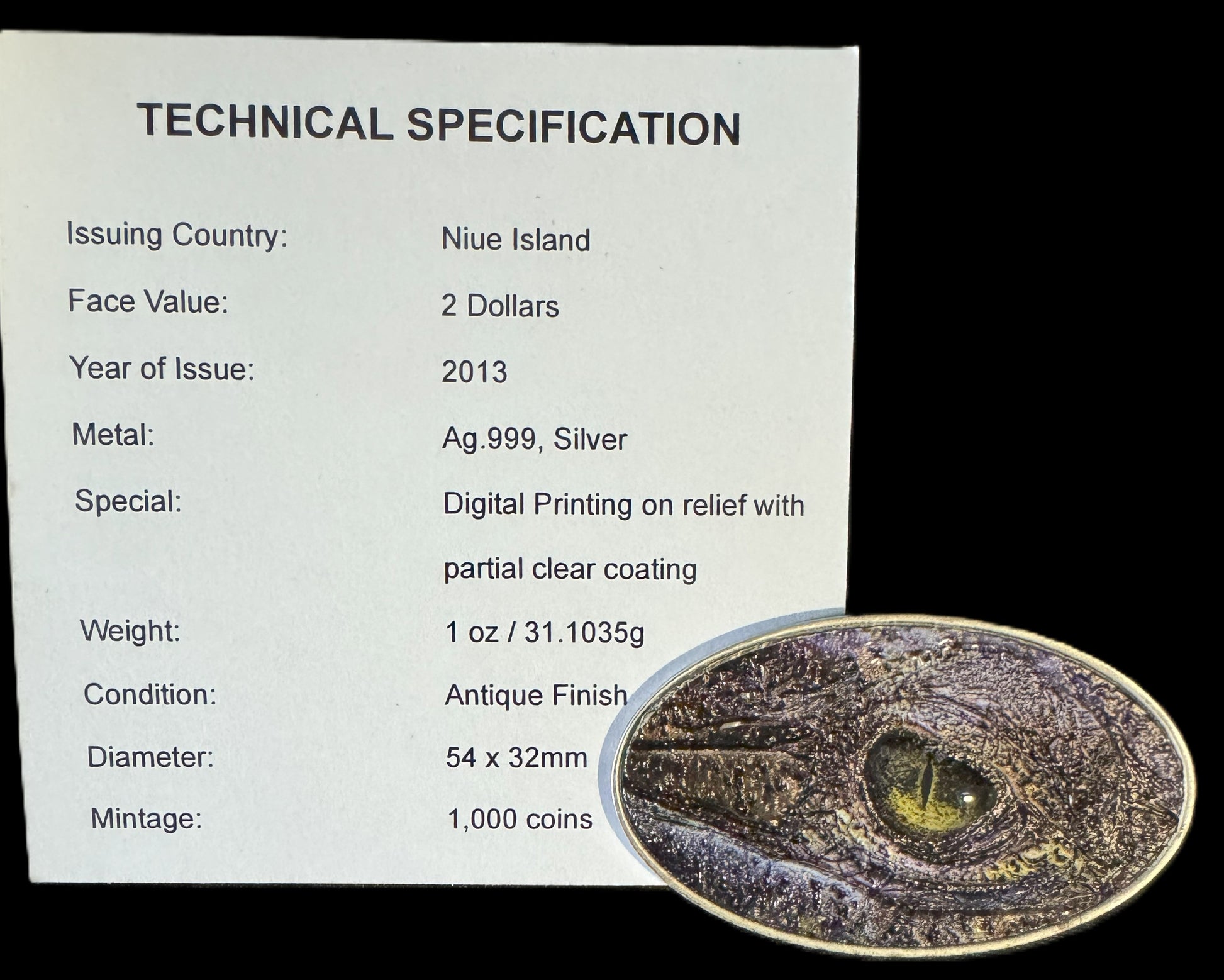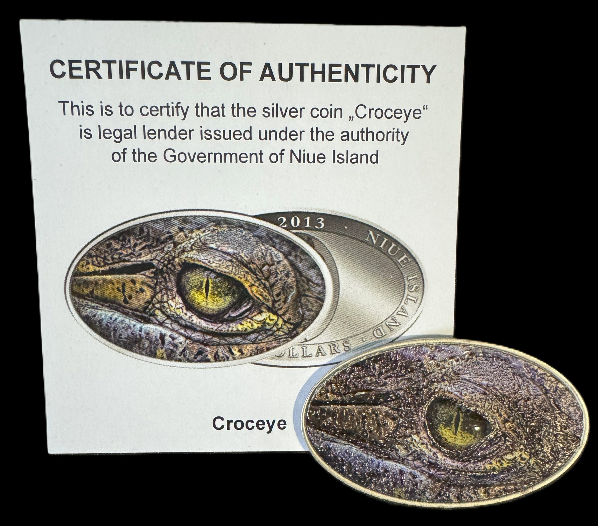 The product is a 2013 Niue 1 oz .999 Silver coin featuring a design known as "Croceye." This bullion coin does not have a specified grade or certification, making it uncertified. The coin is composed of 1 ounce of .999 fine silver and is struck for business purposes. The design and other specific details beyond the year, composition, and precious metal content are not provided.