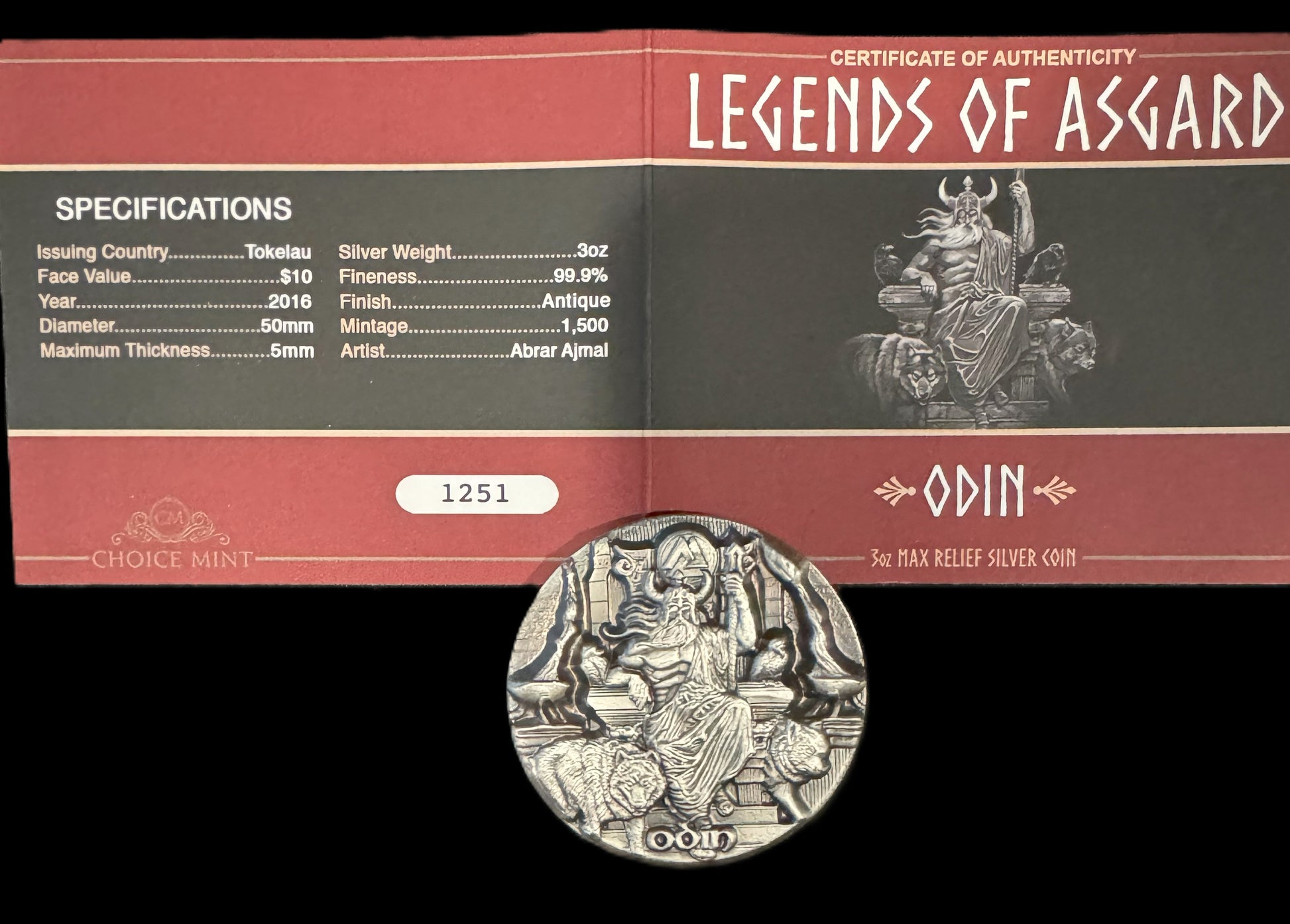 The 2016 Legends of Asgard Odin Ruler of Aesir 3 oz .999 Silver Coin is a beautifully designed coin minted by Choice Mint in Tokelau. This coin features an antique finish and depicts Odin, the ruler of the Aesir in Norse mythology. With a fineness of 0.999, this coin contains a precious metal content of 3 oz of silver. It comes with a Certificate of Authenticity (COA #1251) and is Mint Certified, making it a valuable addition to any collection of bullion or silver coins.