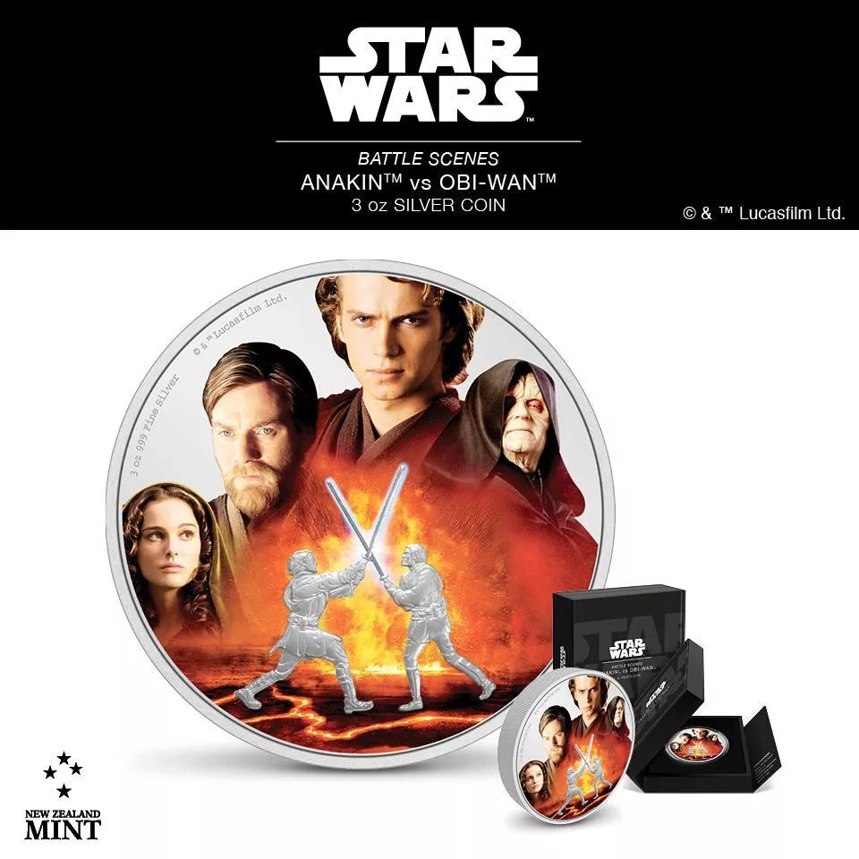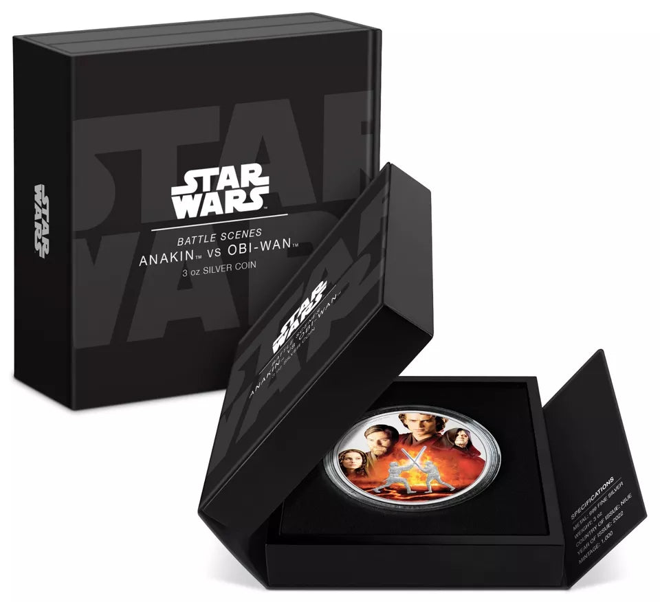 The 2022 Star Wars Anakin vs. Obi-Wan Battle Scenes 3 oz .999 Silver Coin is a commemorative coin minted by the New Zealand Mint. It features a depiction of the iconic battle between Anakin Skywalker and Obi-Wan Kenobi from the Star Wars franchise. This proof coin contains 3 oz of .999 fine silver and is produced in Niue. The coin is a limited edition piece with a total precious metal content of 1 oz, making it a valuable collector's item for fans of Star Wars and numismatics alike.