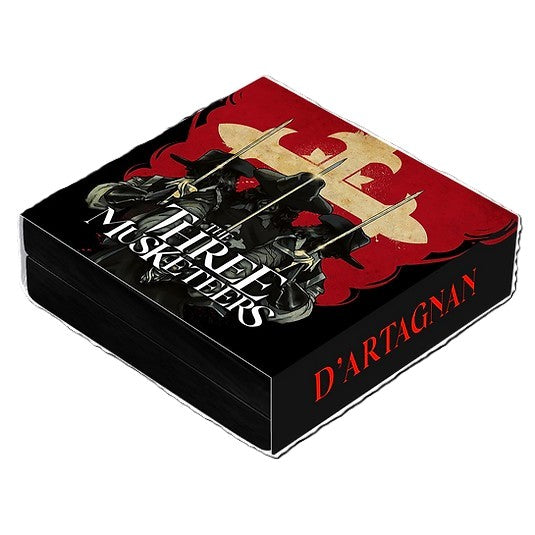 The Three Musketeers novel narrates the adventures of a young 18-year-old Gascon, known as D'Artagnan, who goes to Paris to become a musketeer. The real musketeers are Athos, Porthos and Aramis, inseparable friends. D'Artagnan confronts all of them, but they finally become his friends. Together they serve King Louis XIII and confront his Prime Minister, Cardinal Richelieu and his agents. The reverse depicts the moment when D'Artagnan confronts the veteran musketeers for the first time, with the boldness of his youth. Behind the scene is another seated musketeer and other villagers watching the duel, along with some animals and a background of 17th-century Paris, with Notre Dame in the distance. The obverse depicts the royal throne of France, with the crown of Louis XIII and the solido of Richelieu, who were vying for control of the country. A kneeling musketeer swears allegiance in the throne room of the Royal Palace, three pistols and three swords, representing the three musketeers, and the Public Seal of Niue.