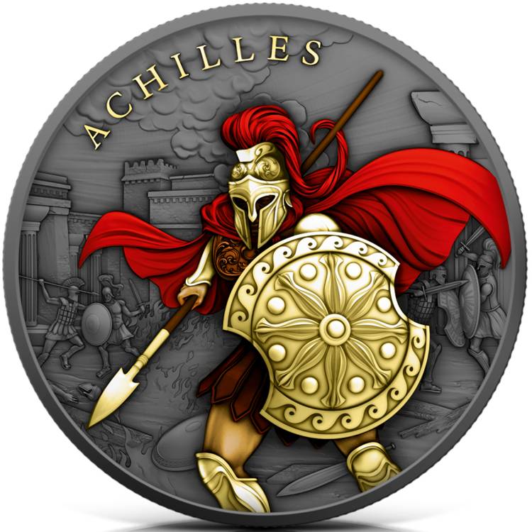 Crafted from .999 fine silver and meticulously adorned with 24k gold plating, ruthenium, and vibrant colorization, this 1 oz coin showcases a powerful image of Achilles, clad in armor and ready for battle. The intricate details, including the iconic shield and spear, highlight the hero’s prowess and bravery, while the background vividly captures a fierce combat scene.