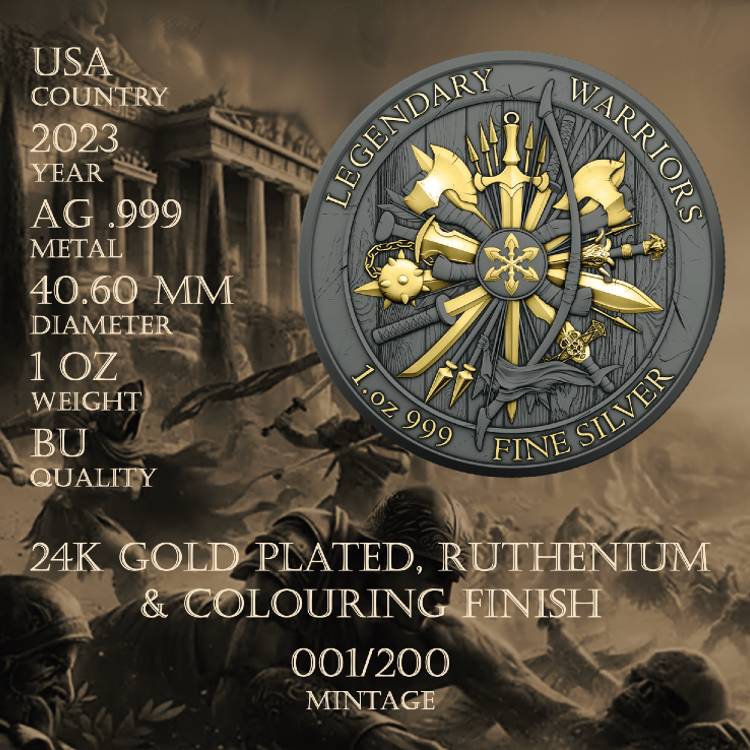 On the reverse side, an impressive array of weapons, gilded in 24k gold, embodies the might and resilience of legendary warriors throughout history. The coin’s diameter of 40.60 mm offers a generous canvas for this artwork, emphasizing the expert craftsmanship involved in its creation. With a limited mintage of only 200 pieces, this Brilliant Uncirculated (BU) quality coin is a rare and valuable addition to any collection.