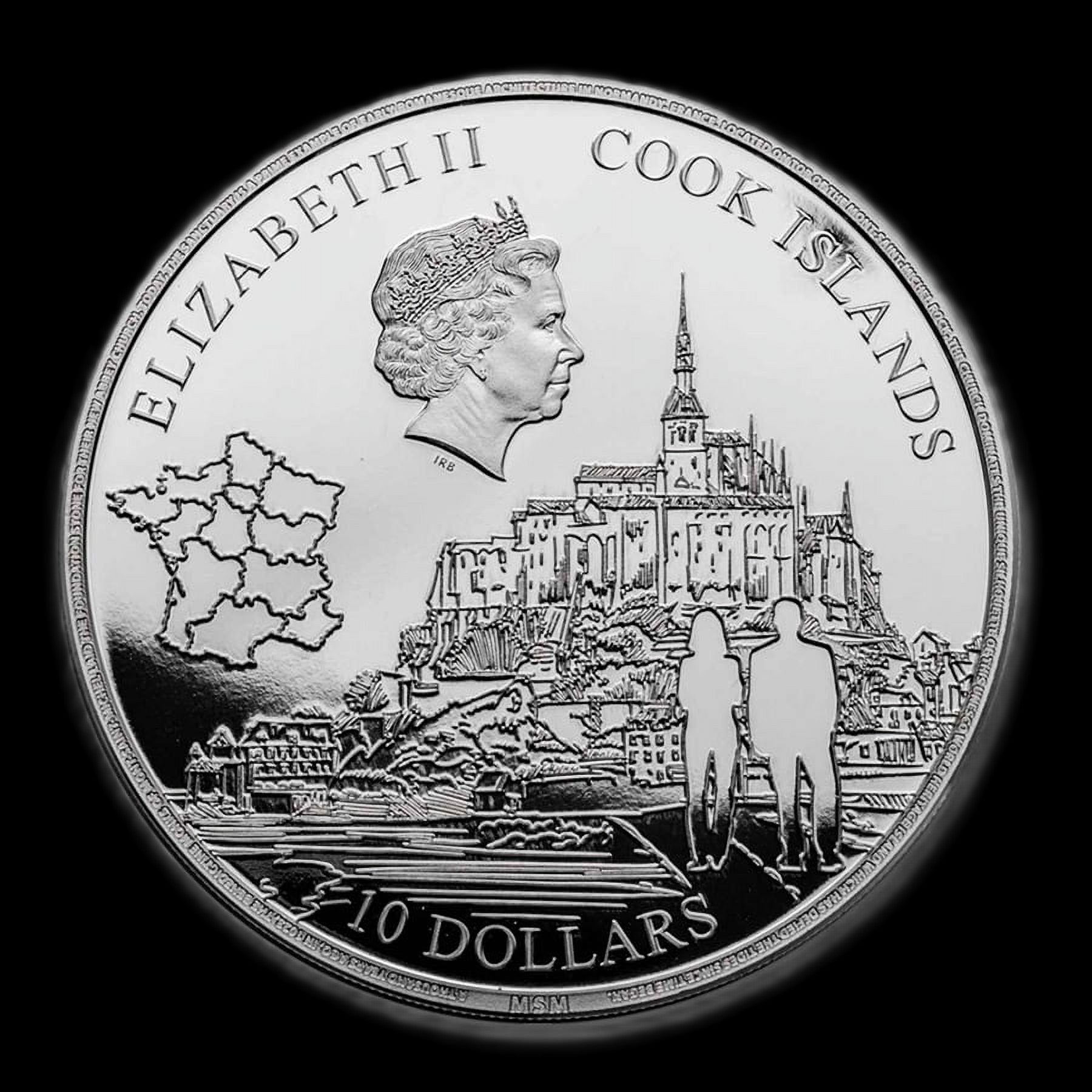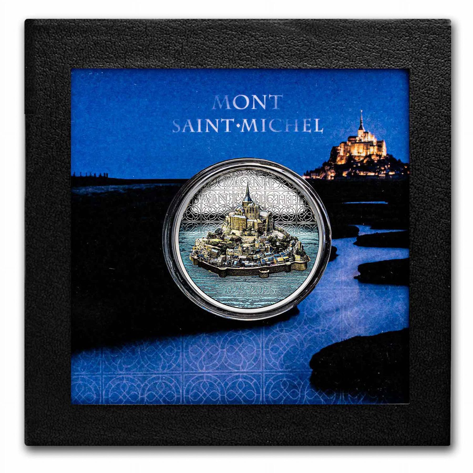 The product is a 2023 Cook Islands Mont Saint-Michel 2 oz .999 Silver 3D Ultra High Relief Coin. It is composed of 0.999 fineness silver with a weight of 2 oz. The coin features a round shape and is minted in Cook Islands. The design likely showcases Mont Saint-Michel in 3D ultra high relief, providing intricate detail and texture to the coin. This collectible piece is an impressive addition to any silver or numismatic collection.