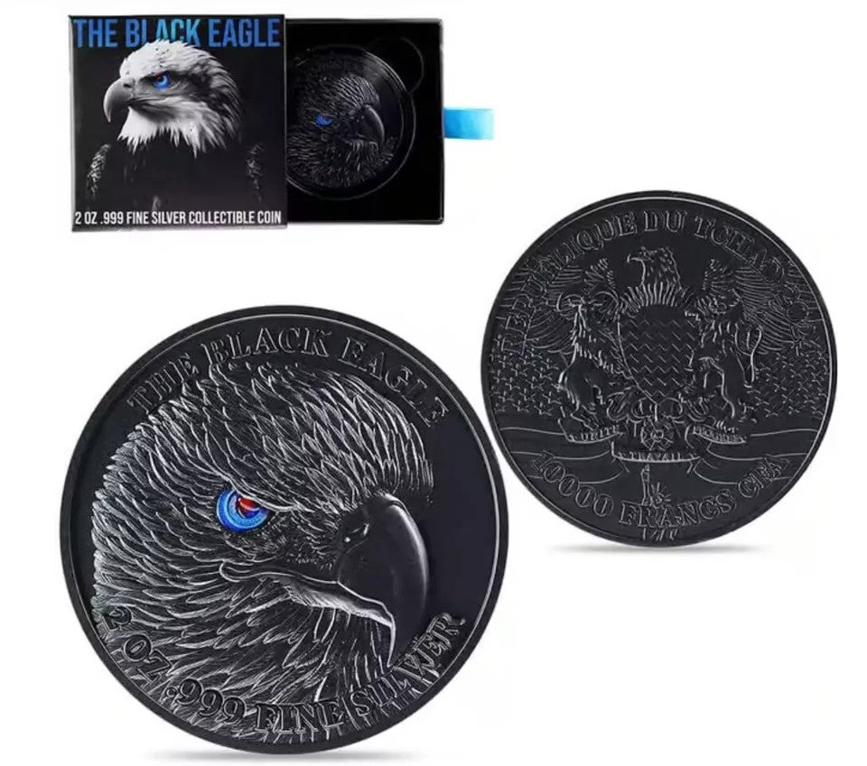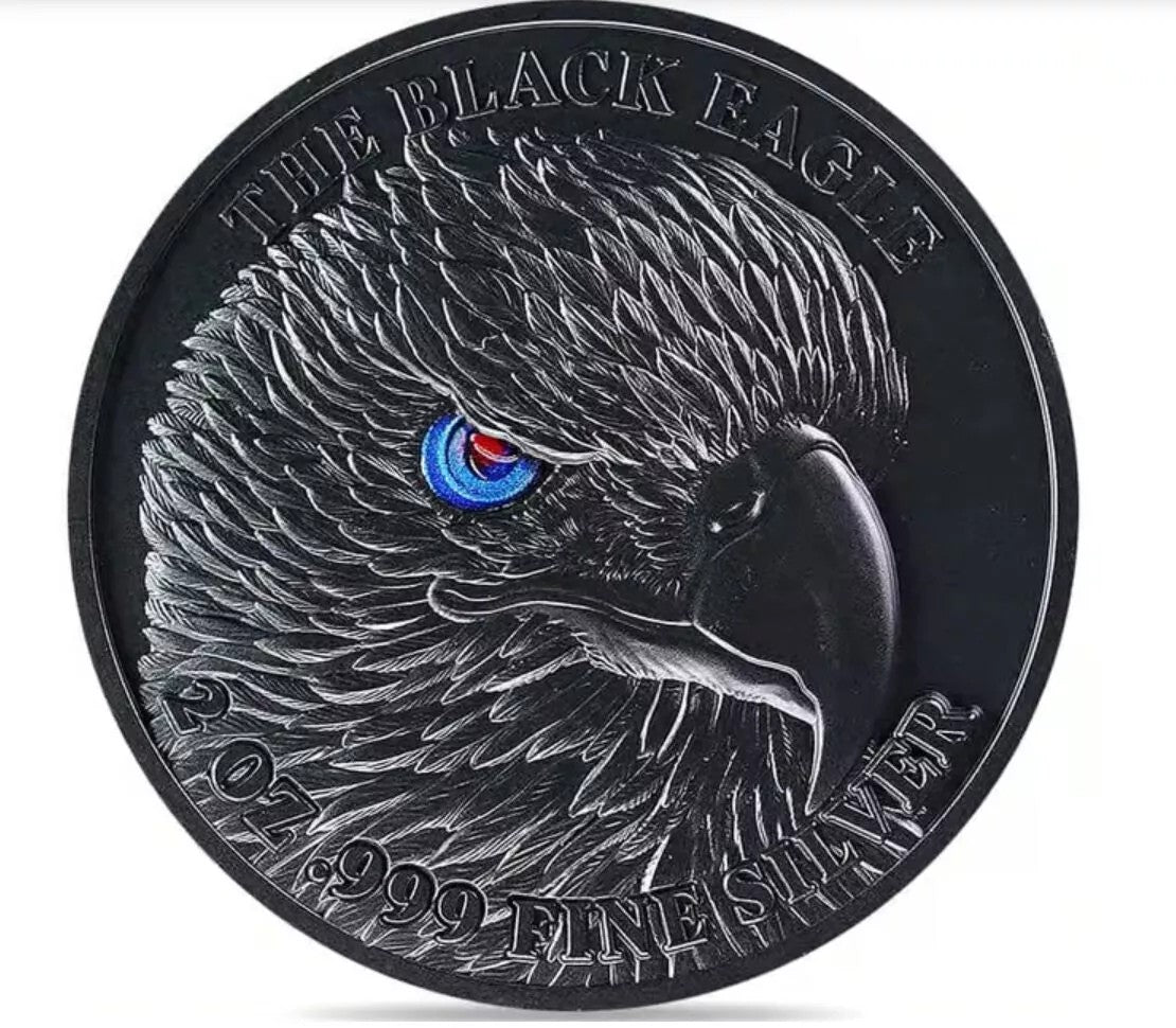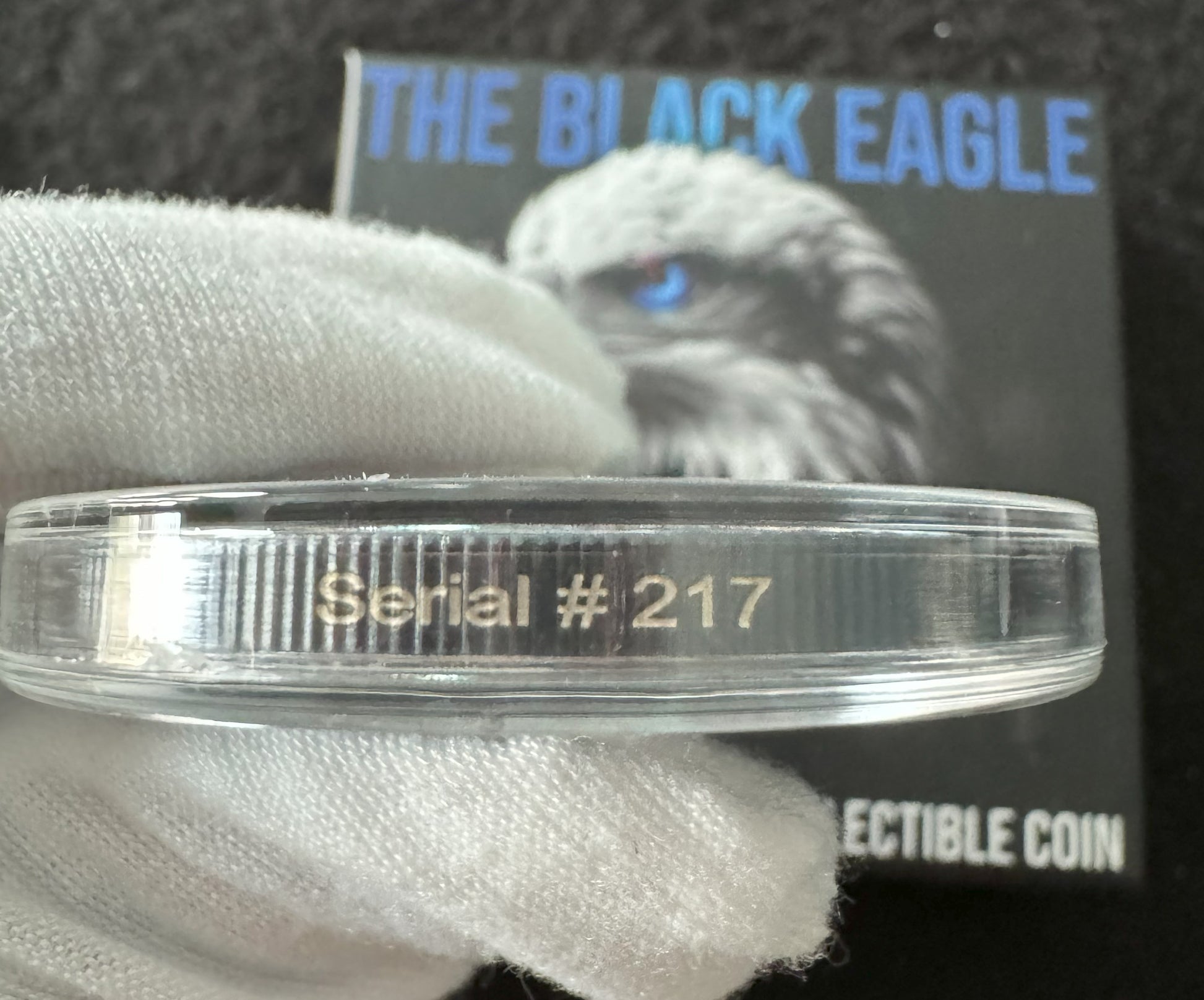 The 2024 Black Eagle 2 oz .999 Silver Coin is a proof strike type coin with a fineness of 0.999. The coin features a Black Eagle design and is uncertified. The Precious Metal Content per Unit is 2 oz of silver. The coin has a year of mintage of 2024 and a serial number of 217.