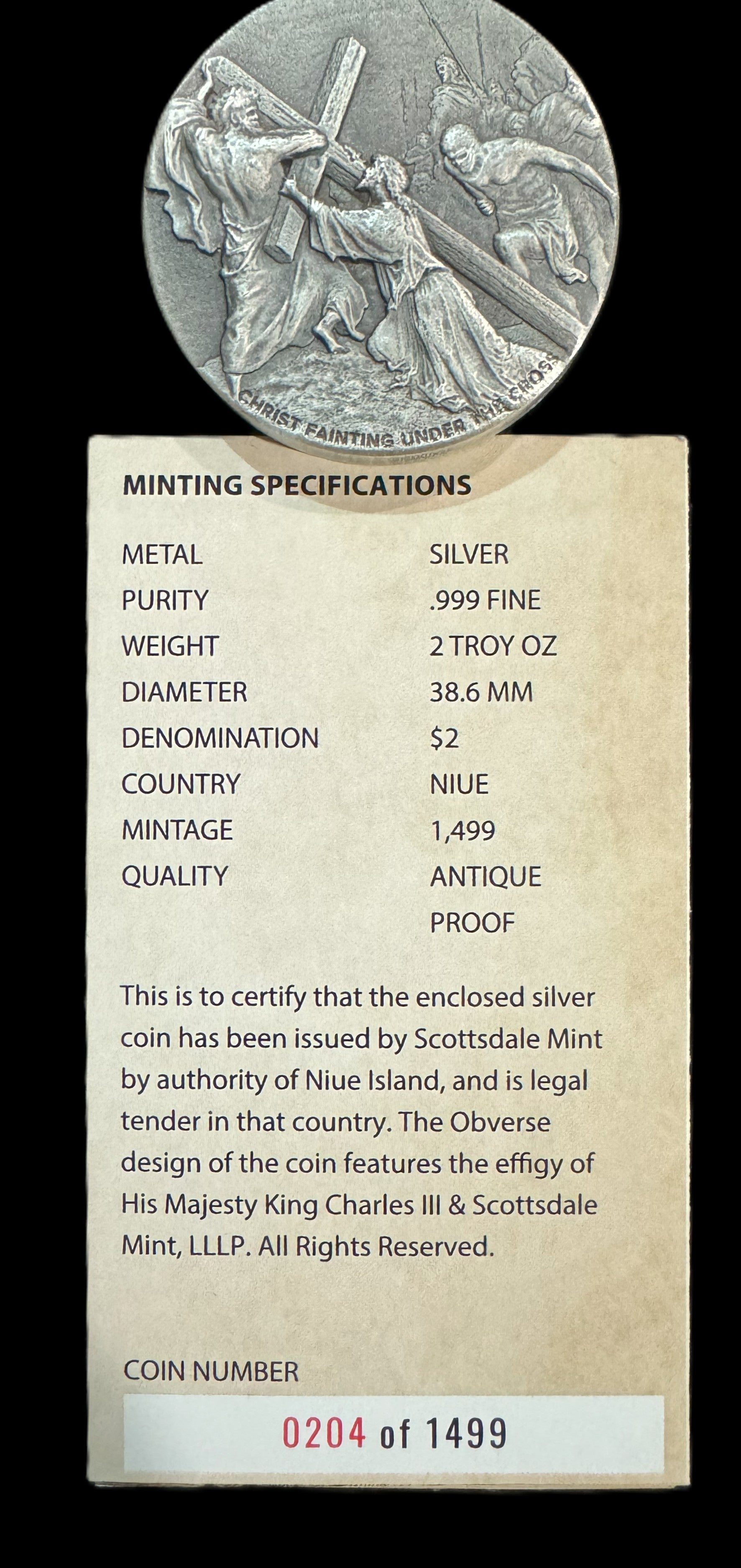 The 2024 Christ Fainting 2 oz .999 Silver Coin is a beautifully crafted piece from the Scottsdale Mint, featuring a business strike type and a fineness of 0.999. This coin contains 2 ounces of silver and is mint certified with a COA #204, making it a valuable addition to any collection. The religious imagery of Christ Fainting adds a unique and meaningful aspect to this precious metal coin.