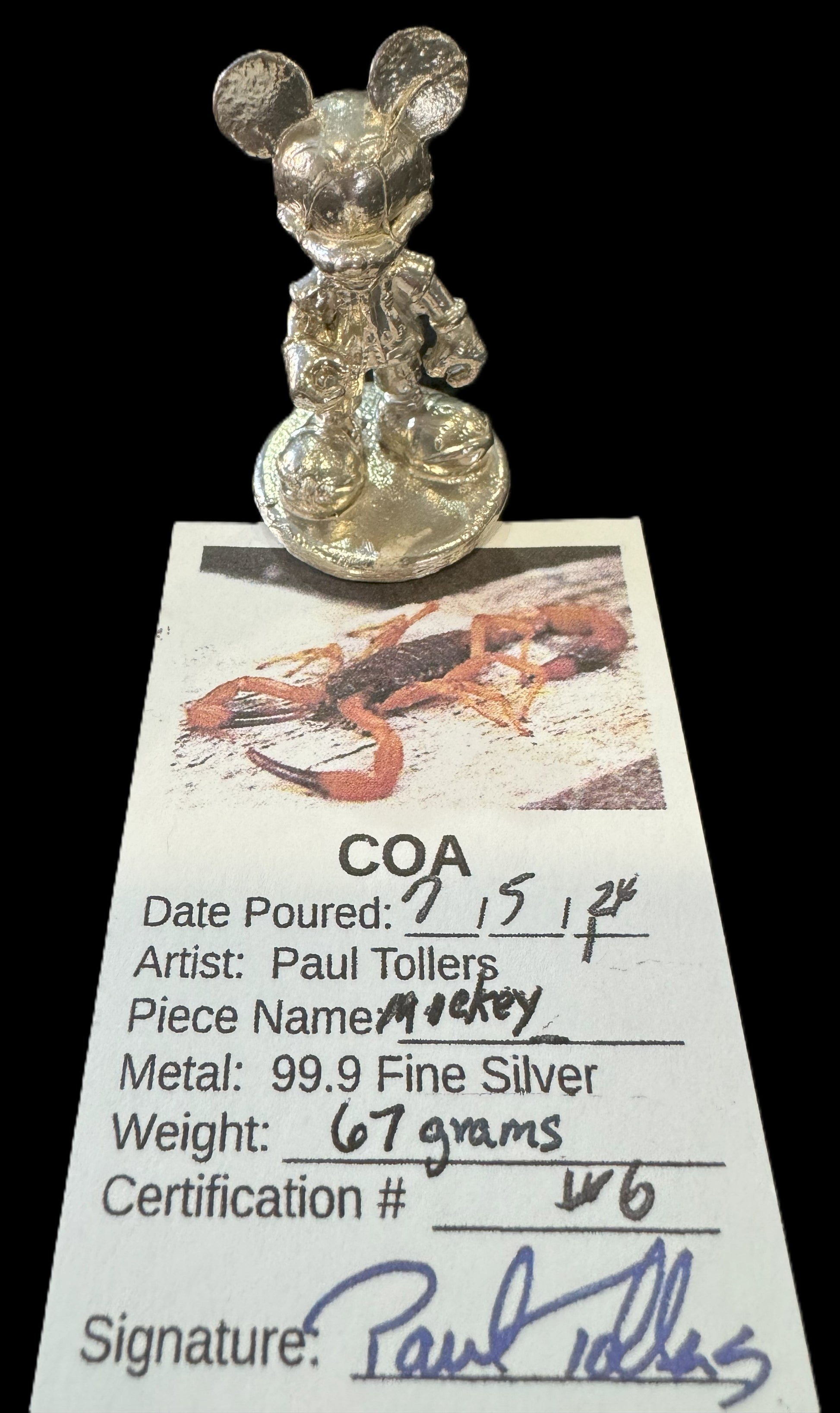 EXTREMELY RARE! HARD TO FIND! VERY LOW MINTAGE! The 2024 Disney Mickey Mouse 2.36 oz 99.9 Silver Statue is a highly collectible item minted by Scorpion Minting. This silver statue features a design of the iconic character Mickey Mouse, from the popular Disney franchise. With a fineness of 99.9 and a weight of 2.36 oz, this contemporary piece is a unique addition for any Disney or silver coin collector. The item also includes a Certificate of Authenticity (#6) and is manufactured in the United States.