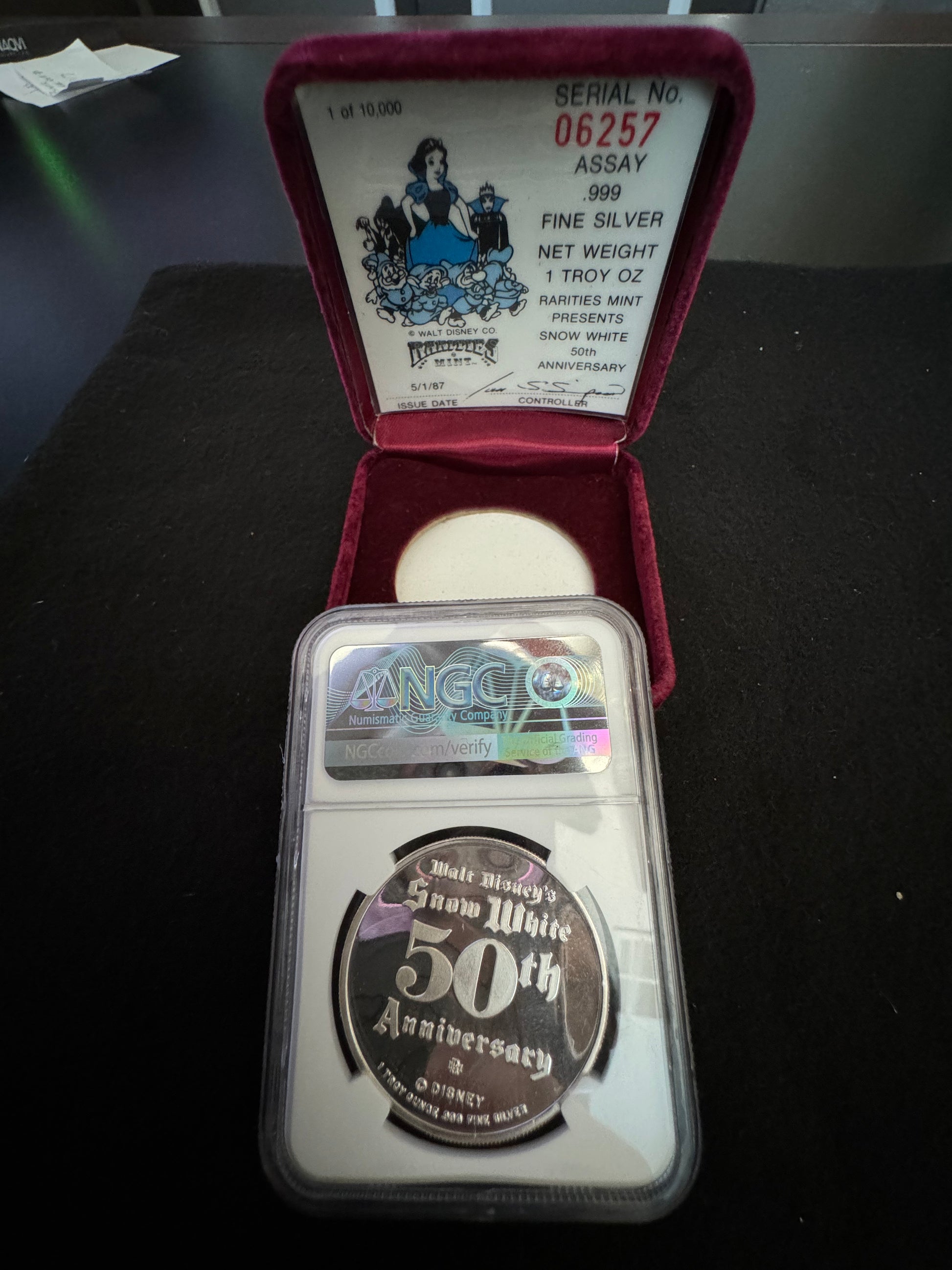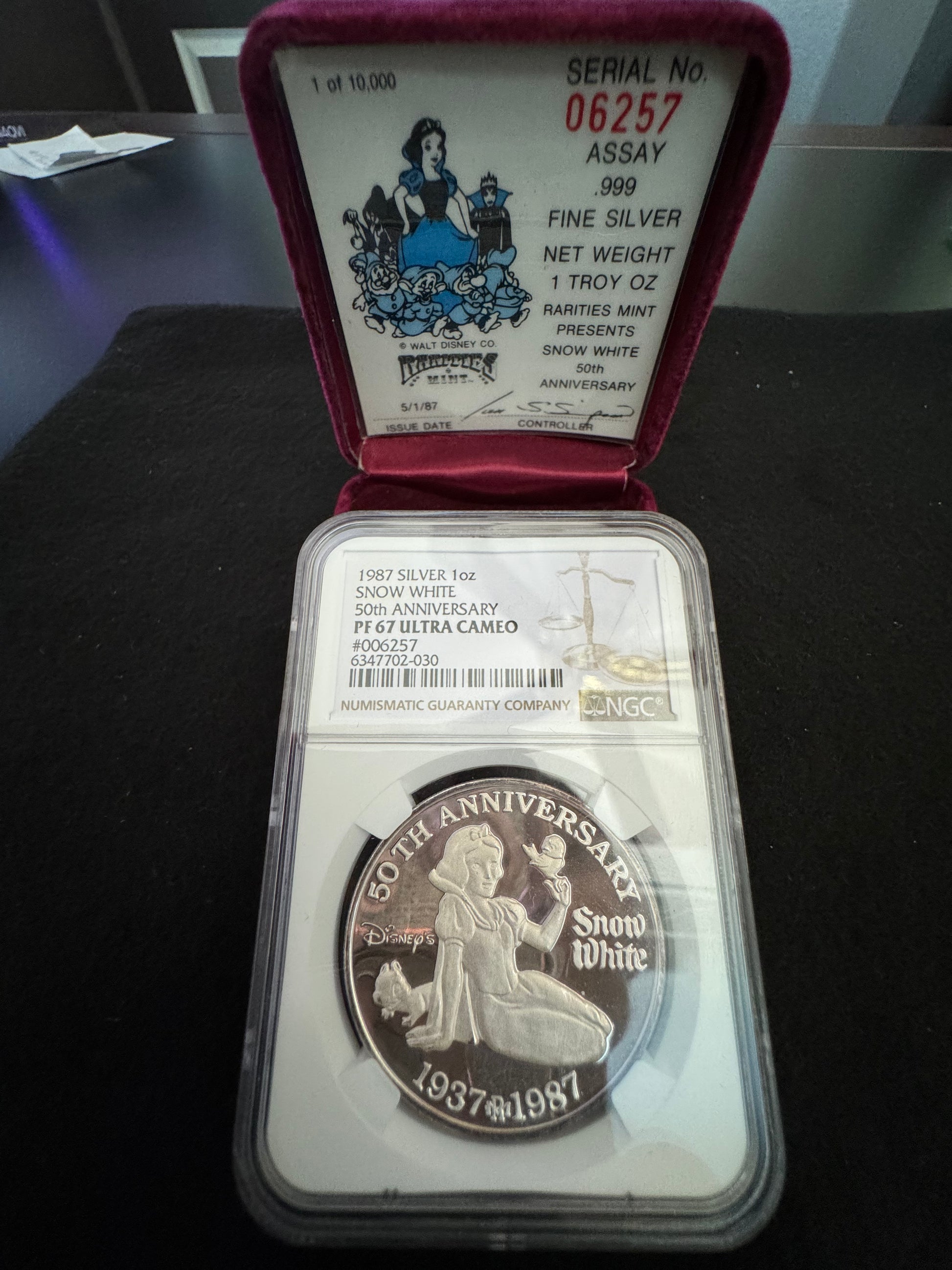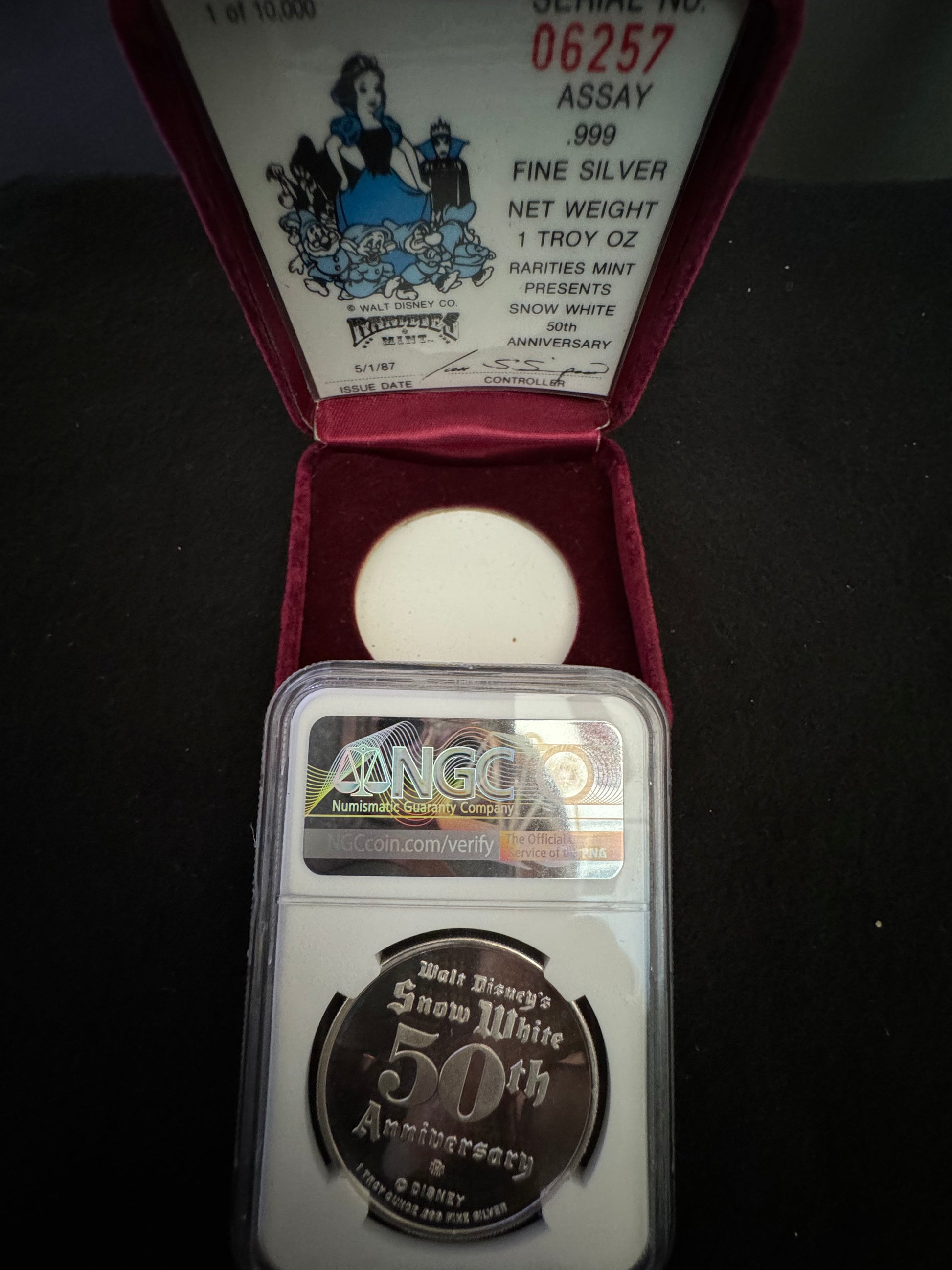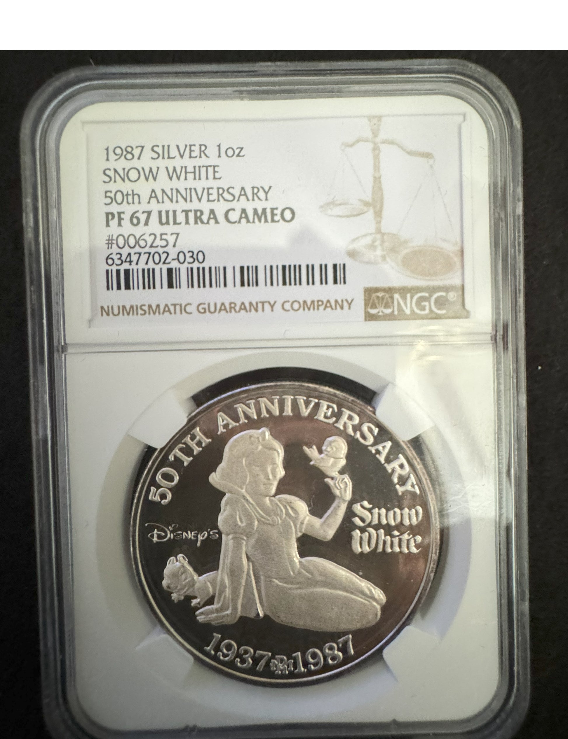 This 1 oz .999 silver coin commemorates the 50th anniversary of Snow White and the Seven Dwarfs. The coin features a round shape with a beautifully detailed design showcasing the beloved characters from the Disney classic. Minted by Rarities Mint in 1987, this coin comes with a COA # of 06257, ensuring its authenticity. The coin is a must-have for any Disney or Snow White fan and is a great addition to any collection. Its fineness and precious metal content make it a valuable investment piece. Don't miss out on the opportunity to own a piece of Disney history with this 50th Anniversary Snow White silver coin.