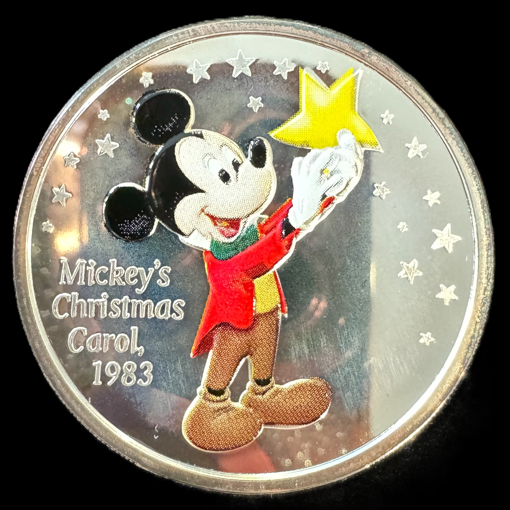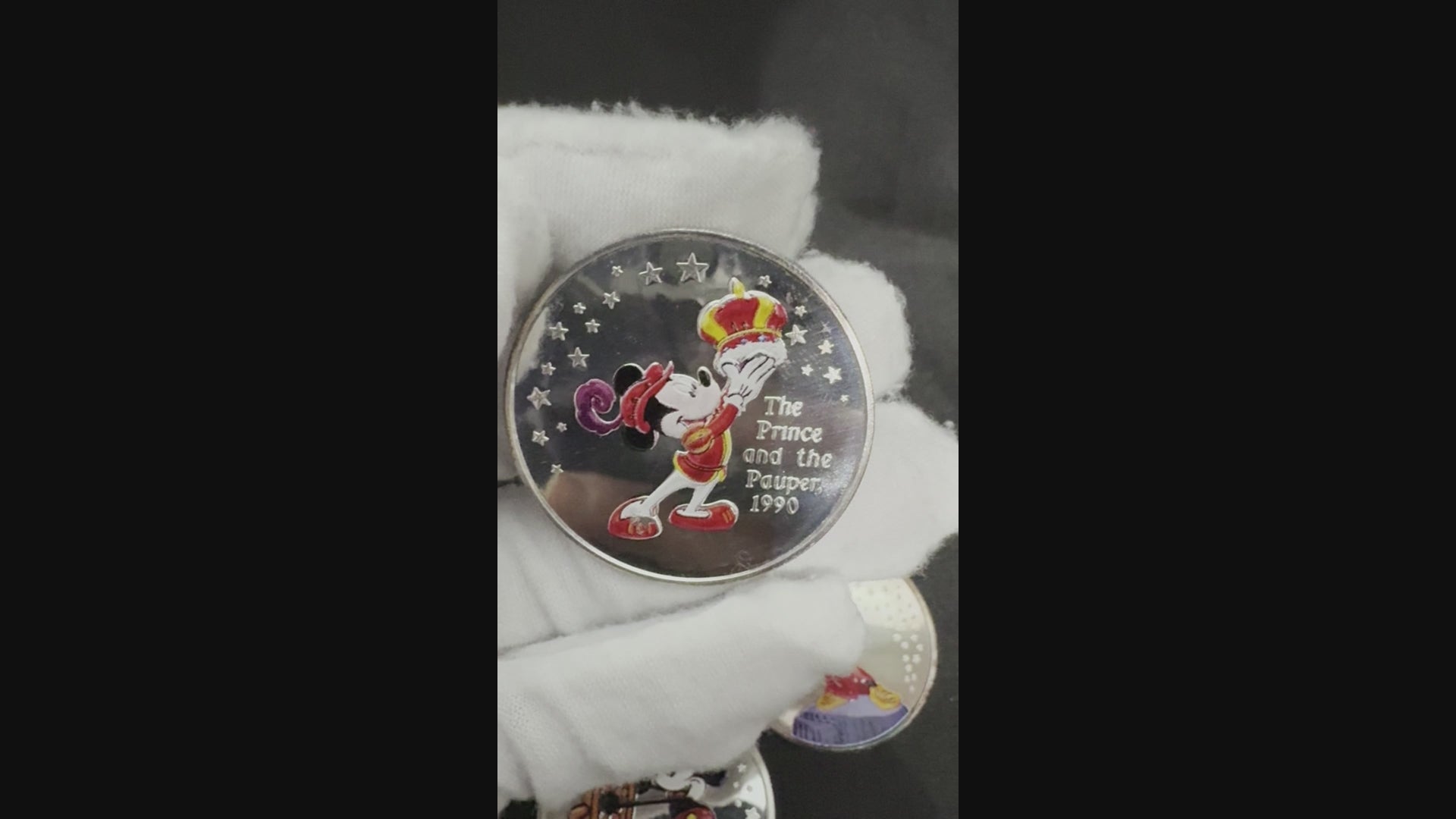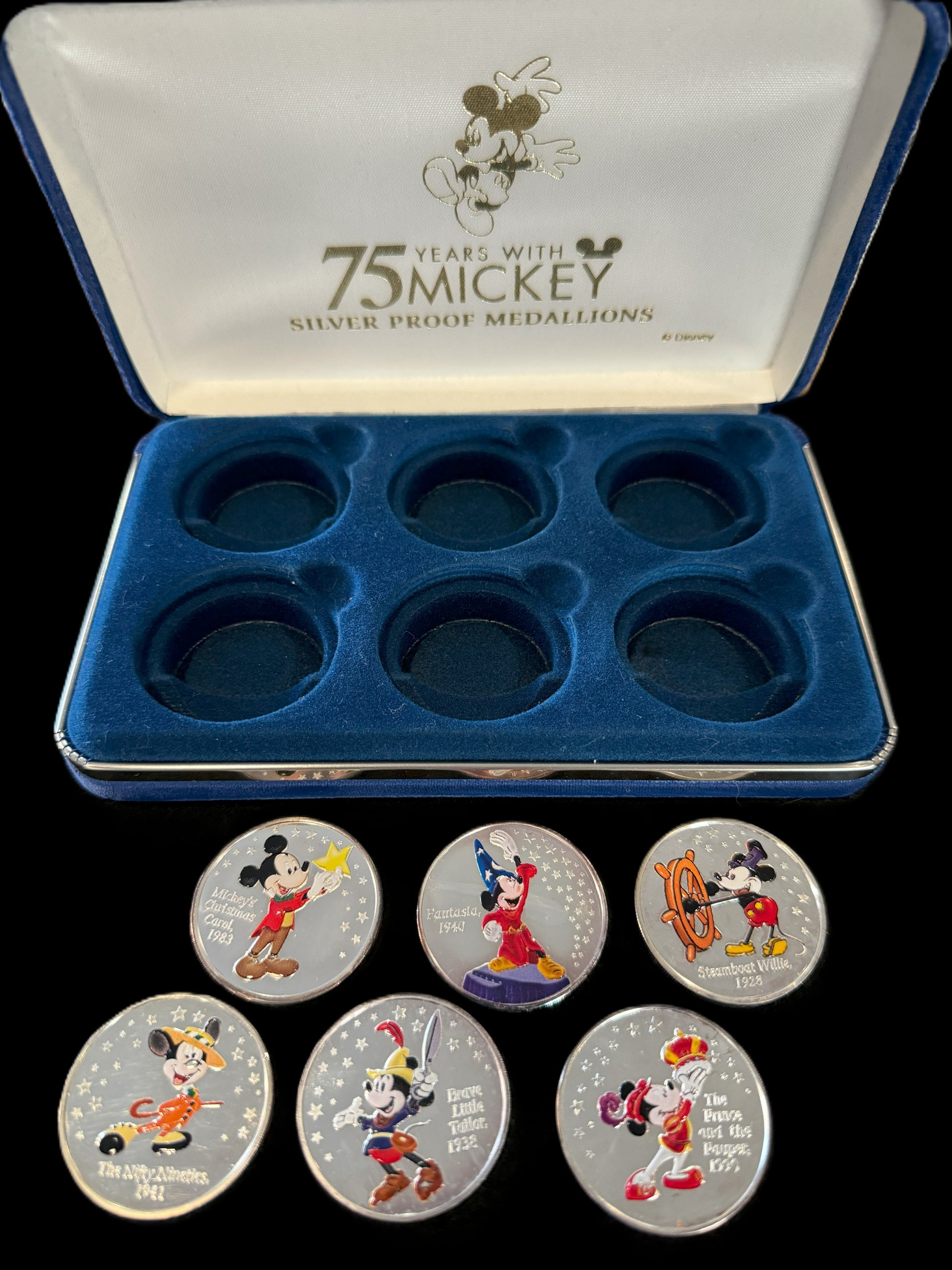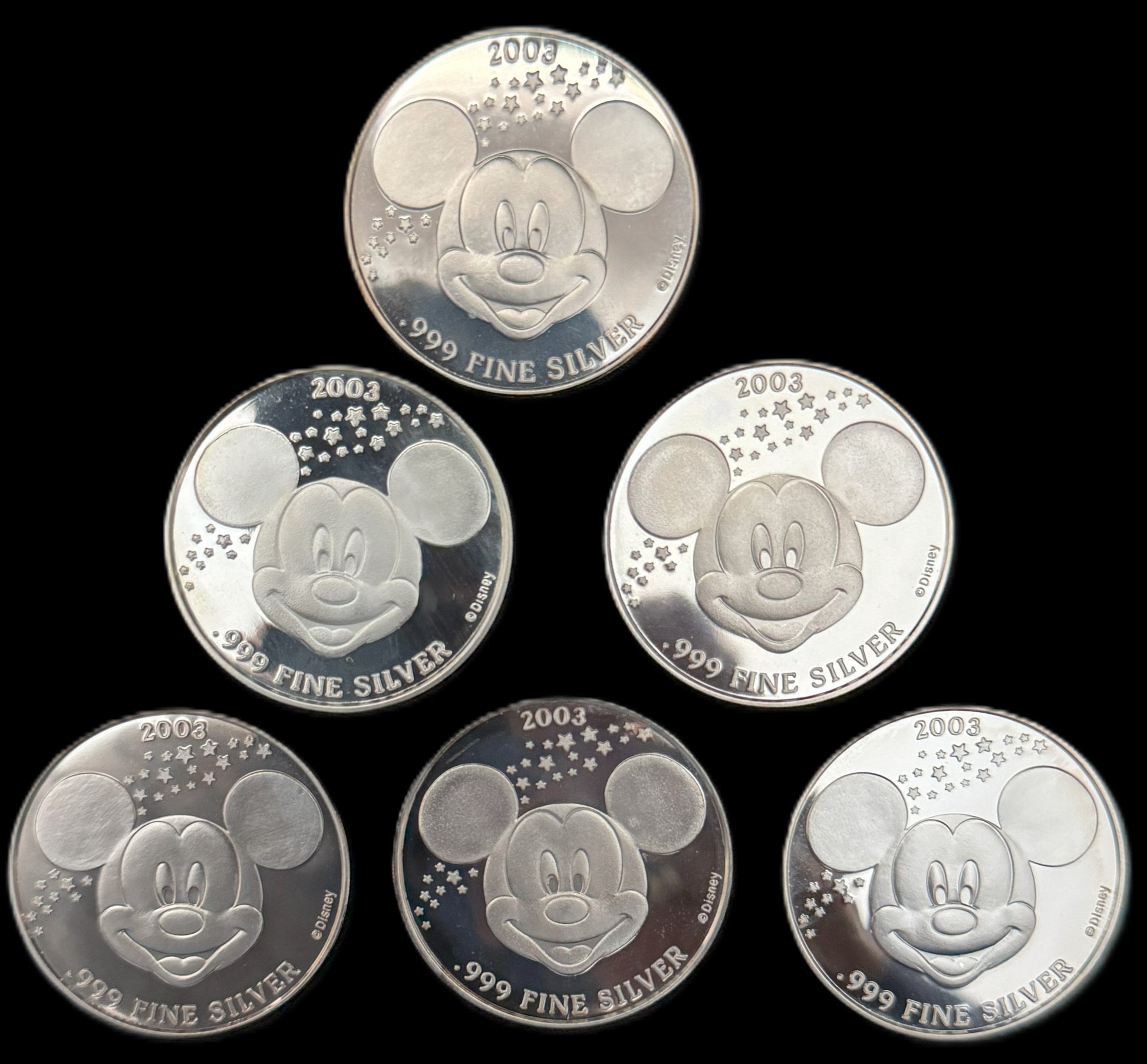 RARE! HARD TO FIND! The "Disney 75 Years with Mickey Colorized 6 - 1 oz .999 Silver Coin" was minted in 2003 in the United States to commemorate Disney's 75th anniversary with Mickey Mouse. This round silver coin features a colorized design of Mickey Mouse and has a fineness of .999, with a precious metal content of 6 - 1 oz. each. It is part of the Disney franchise and comes with a Certificate of Authenticity (COA) number i886. This collectible piece is a unique addition to any Disneyana or coin collection.