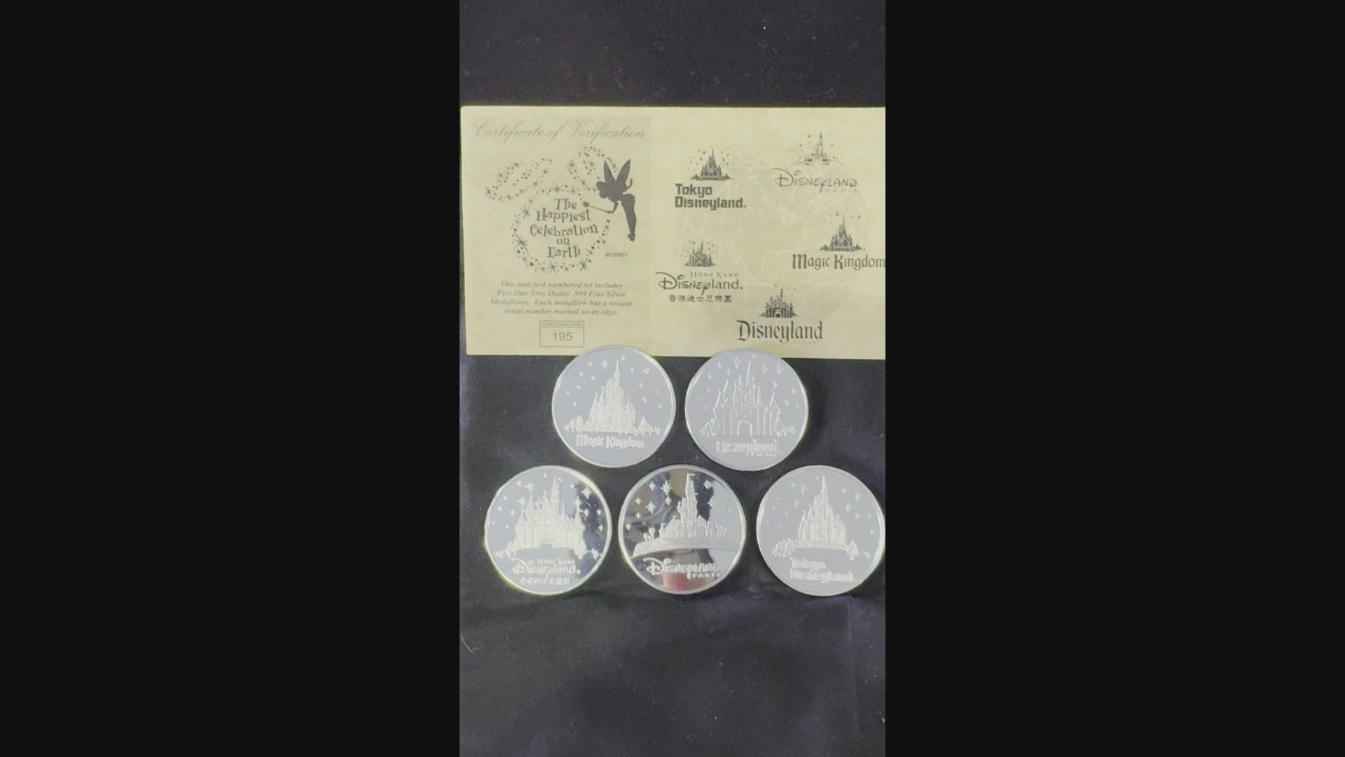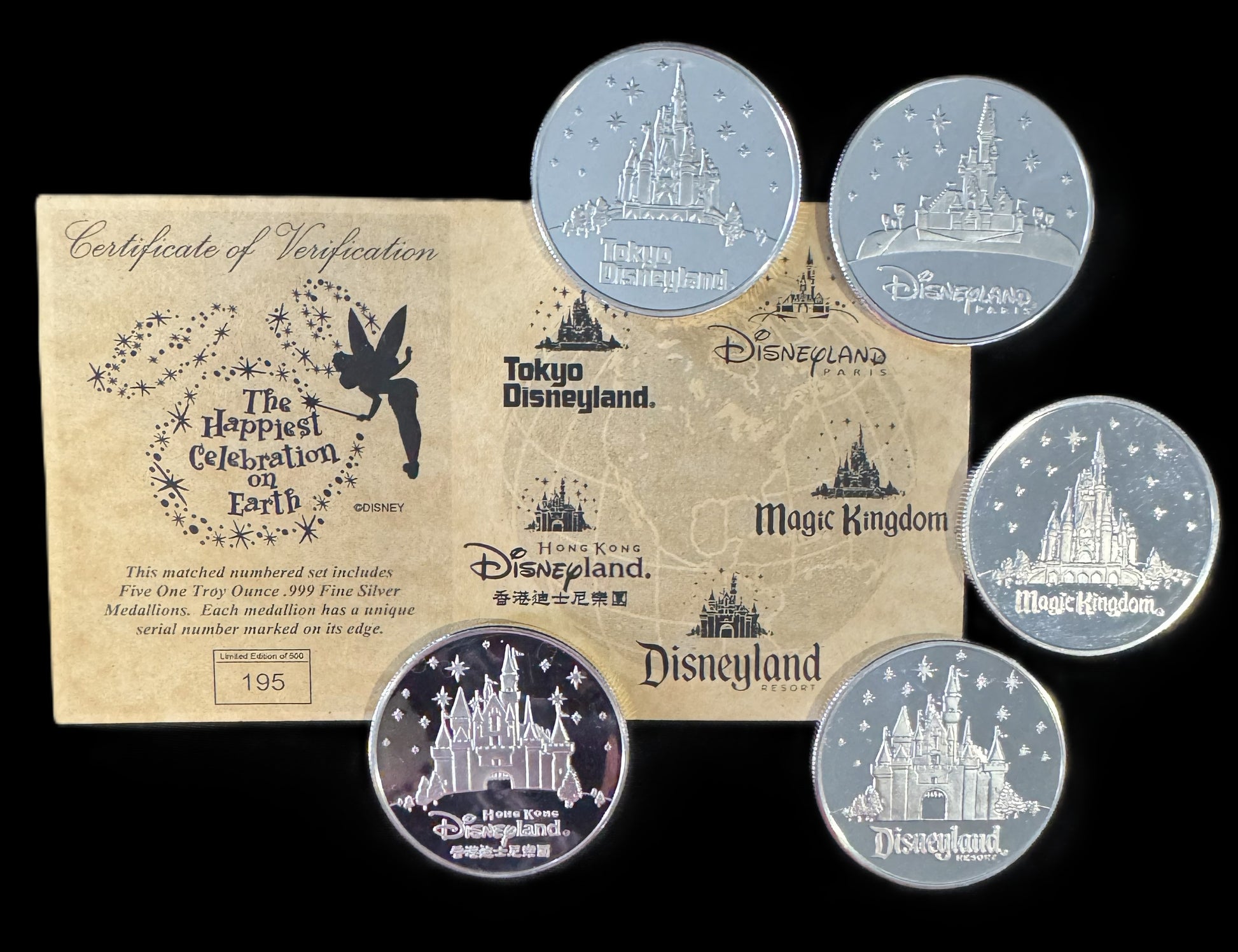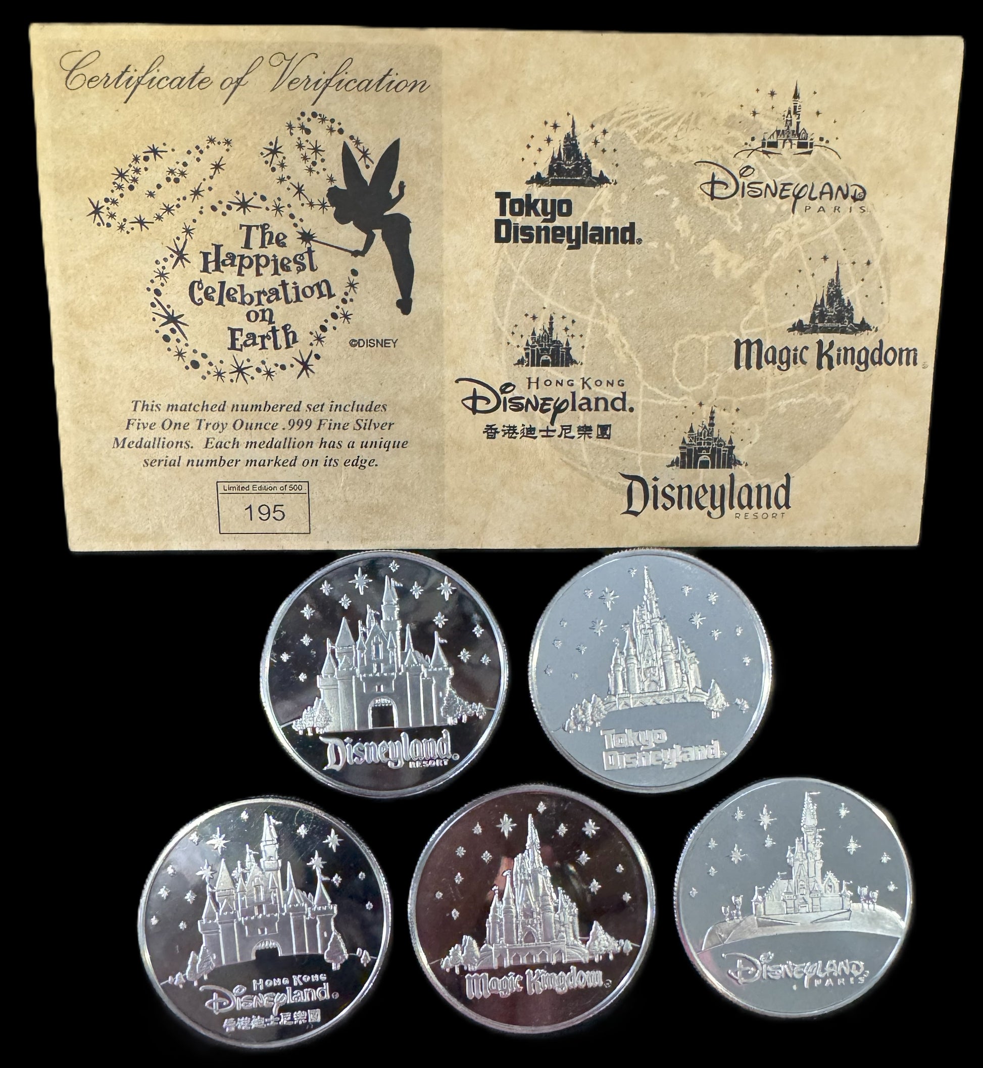 The product is a set of five 1 troy oz .999 silver coins featuring Disney's "The Happiest Celebration On Earth" theme. The coins are round in shape and showcase Disney imagery. Each coin is part of the Disney franchise and comes with a Certificate of Authenticity (COA) number 195. This contemporary collectible item is a valuable addition to any Disney or coin collection.