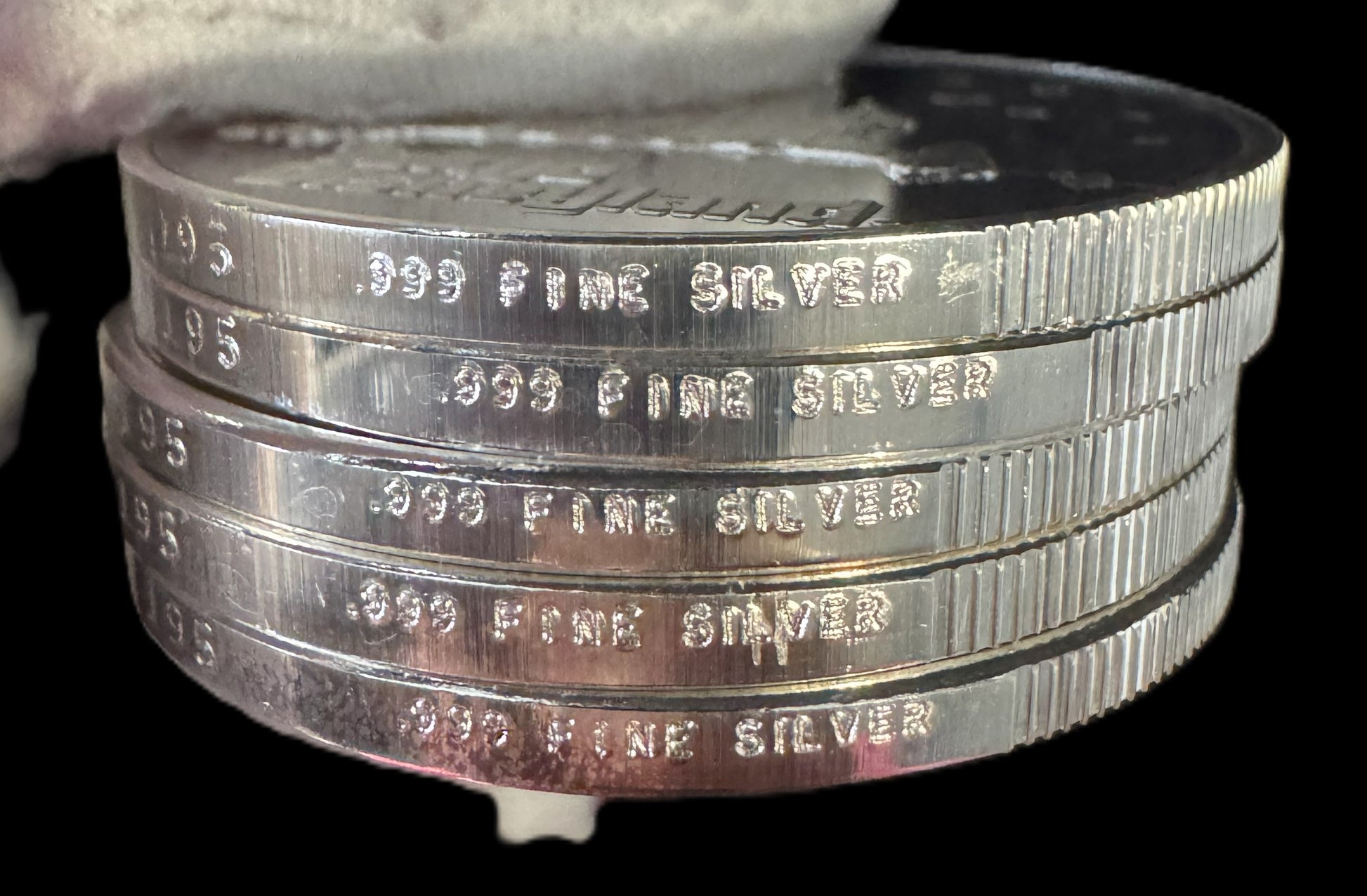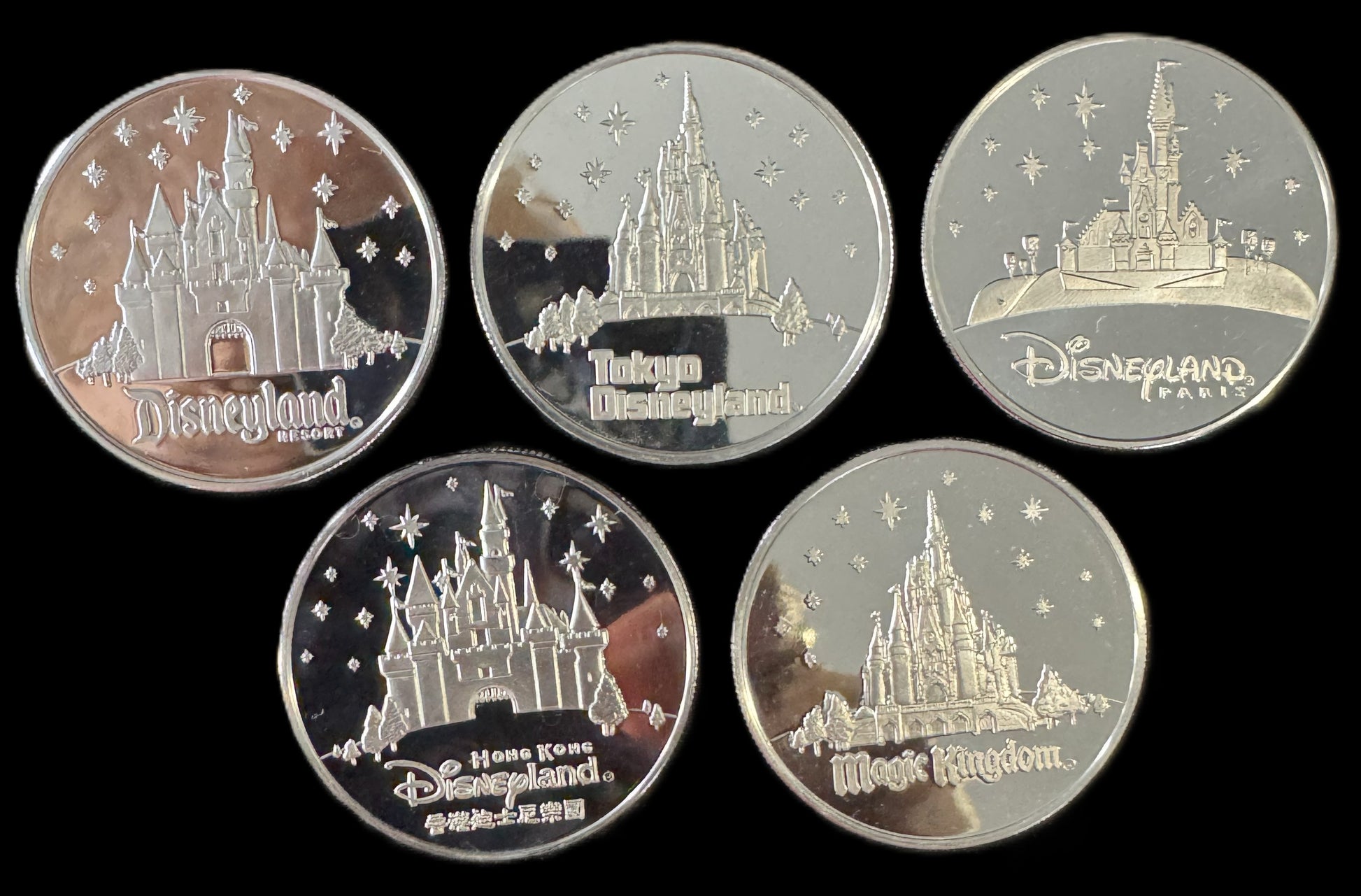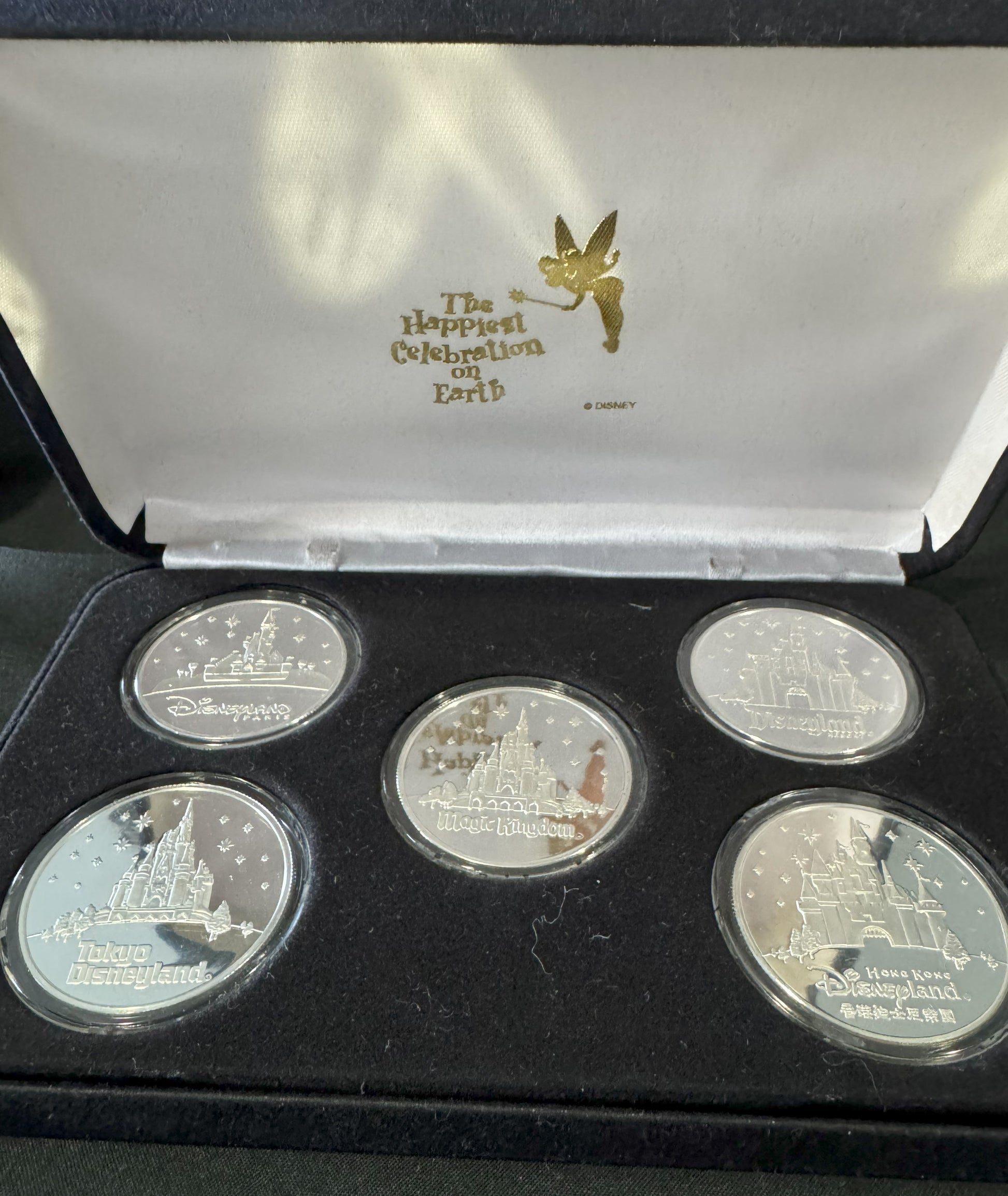 The product is a set of five 1 troy oz .999 silver coins featuring Disney's "The Happiest Celebration On Earth" theme. The coins are round in shape and showcase Disney imagery. Each coin is part of the Disney franchise and comes with a Certificate of Authenticity (COA) number 195. This contemporary collectible item is a valuable addition to any Disney or coin collection.